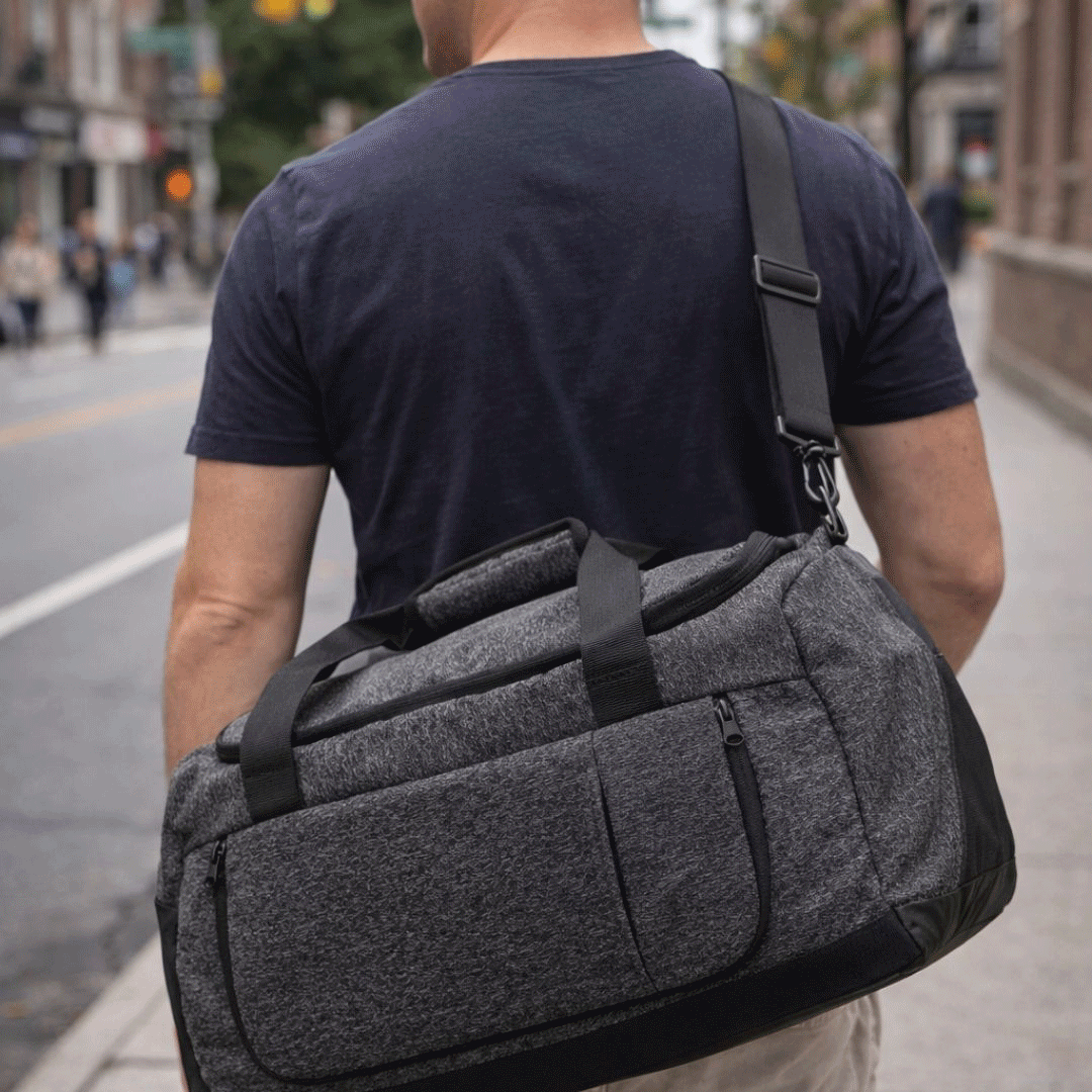 Bolso fabricado en tela de polyester, tiene 3 cierres principales, un compartimento exterior de red y espacios pequeños en el interior. Bolsillo frontal con bolsa para zapatillas o ropa sucia. Dimensiones: 49 x 24 x 22,5 cm. Aplicación de logo a full color. Presentado en caja premium imantada de 34×23 cm con logo y/o gráfica a un color.