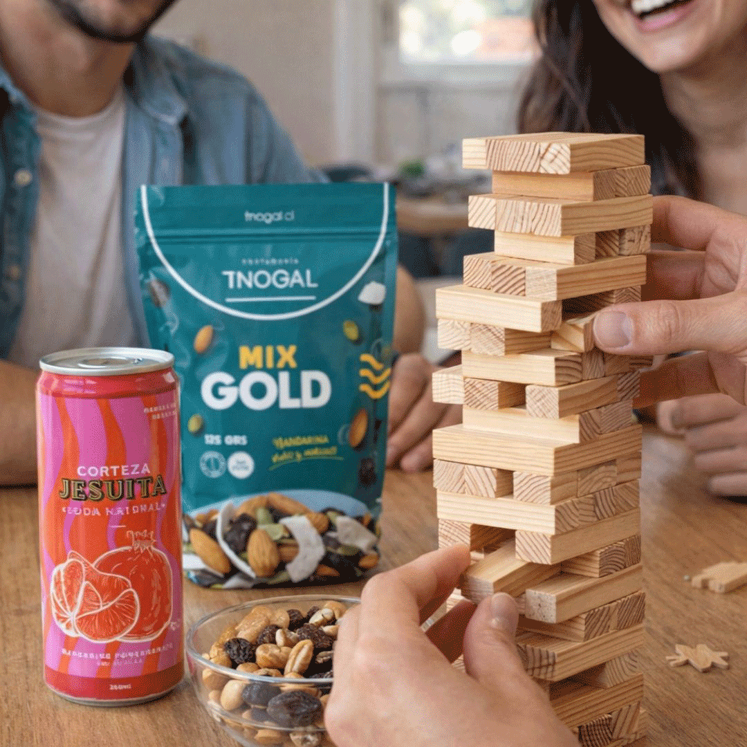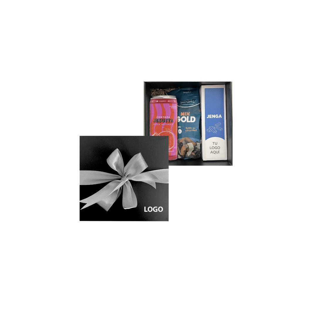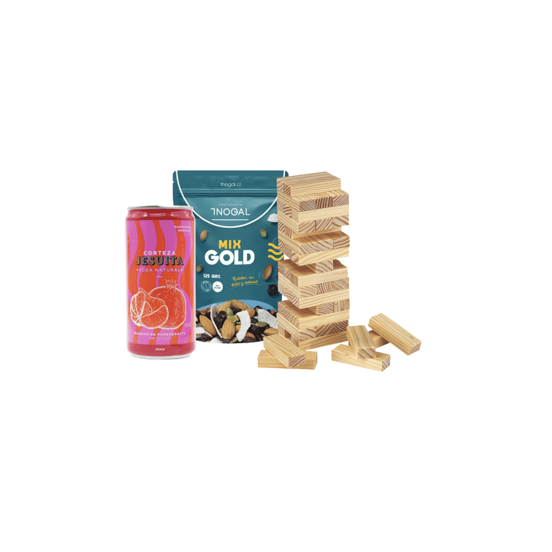 Descripción: Jenga de 5 x 16 x 5 cm. Bloques de madera que forman una torre. Cuenta con 45 piezas totales. En caja (color puede variar según la partida) con adhesivo a full color personalizada por cliente. Mix de frutos secos 125gr Tnogal. Una soda natural de 269ml Corteza jesuita. Sabores variados segun stock. Presentación: Caja premium imantada de 16x16cm. con logo y/o gráfica a 1 color.