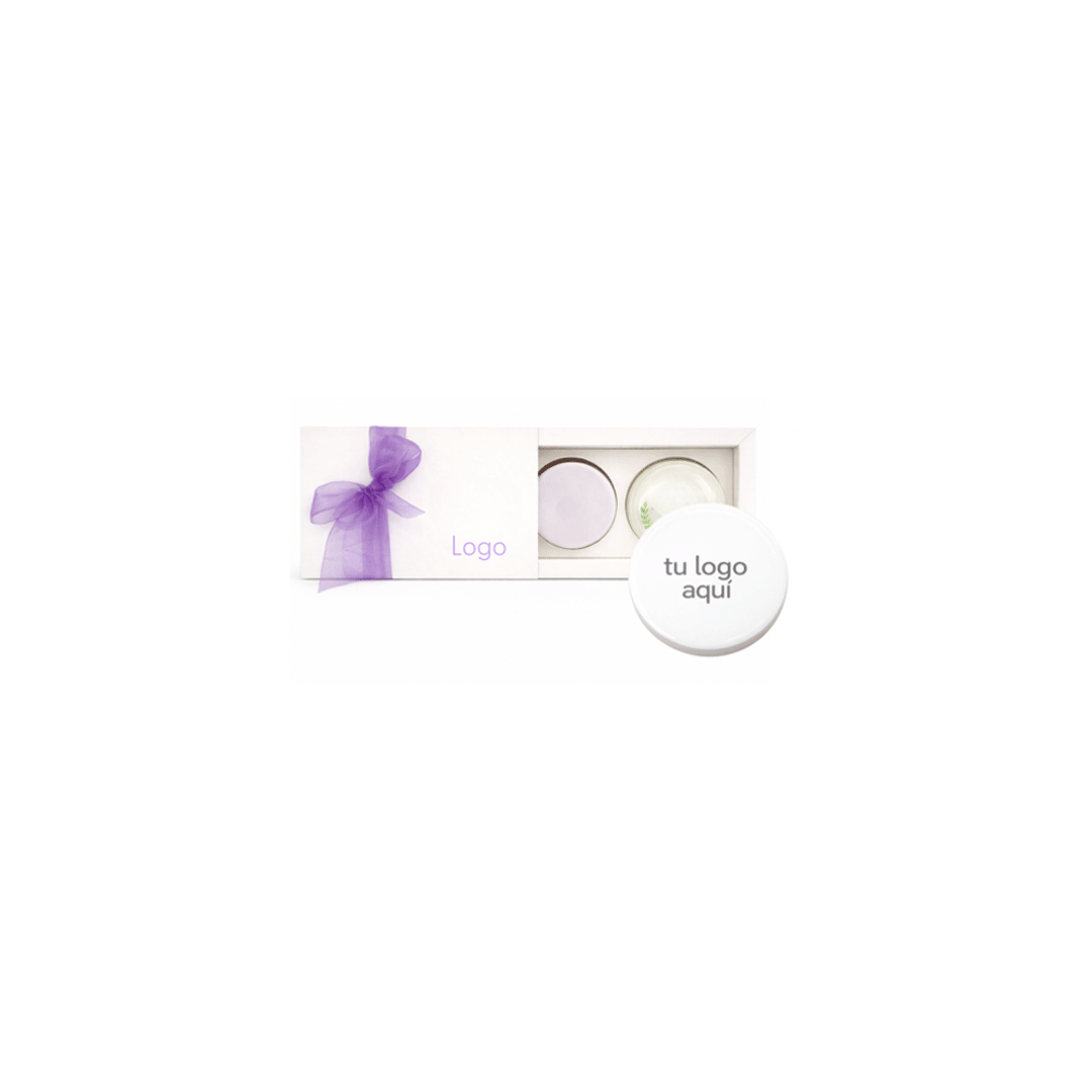 Caja de 2 Jabones de 45 gr. Hechos artesanalmente; cosmética natural, consiente, vegana, biodegradable y libre de parabenos. Logo o diseño a color en el jabón. Presentación en caja con encajes, incluye logo y cinta a un color.