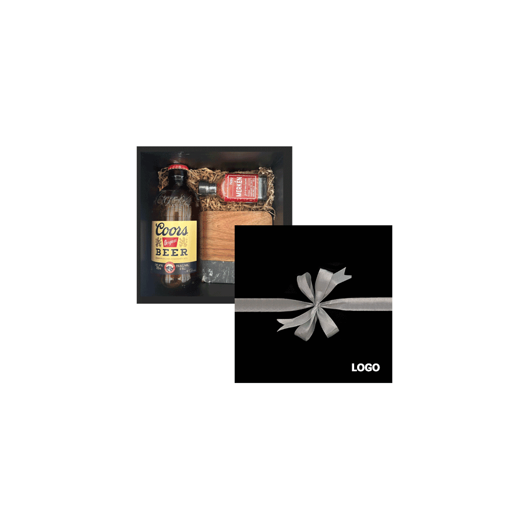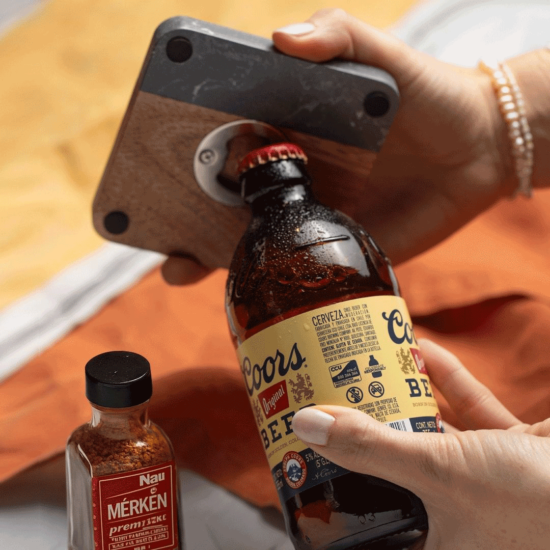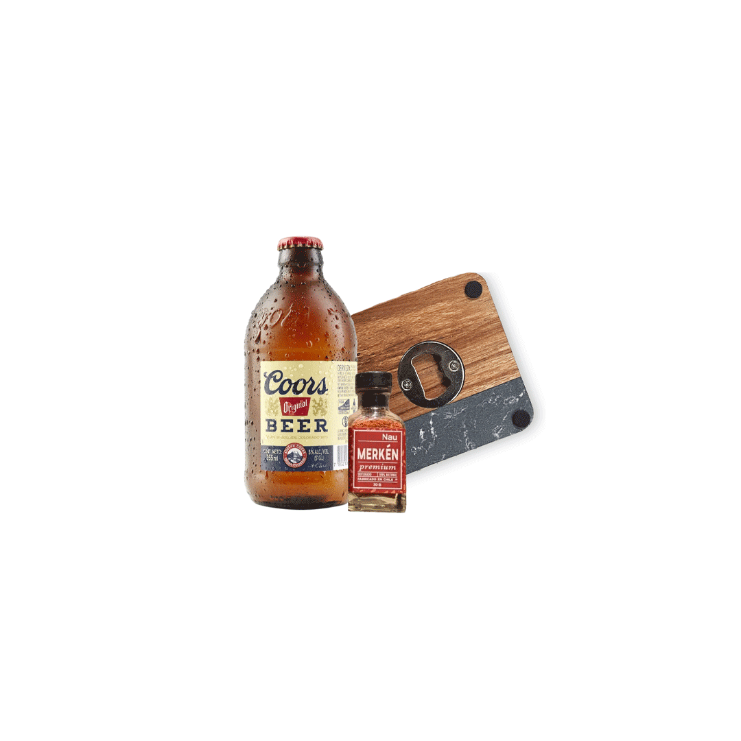 Posavaso cuadrado, de madera y mármol reconstituido en color negro, incluye descorchador en la parte trasera. Tamaño de 10cm. Logo aplicado en grabado laser. Cerveza Coors en botella de vidrio 355 ml. Frasco de Merkén Premium Nau 170 gr. Presentado en caja premium de 16x16cm con logo y/o gráfica a un color.