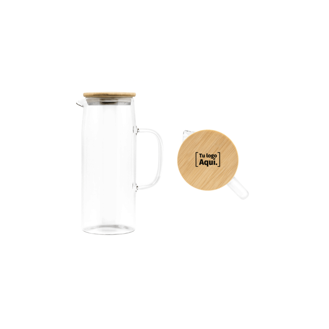 Jarro de Vidrio de borosilicato y bambú. Jarra con pico vertedor y asa de vidrio de borosilicato. Tapa de bambú y acero inoxidable con anillo de silicona antiderrame con logo a 1 color en tapa de jarra. Presentado en caja Kraft con sticker personalizado con saludo y logo cliente.