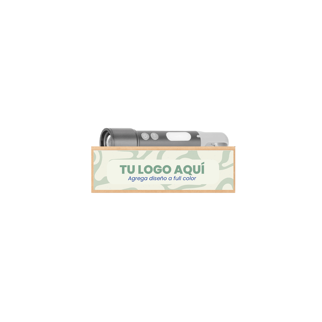 Linterna táctica recargable de Aluminio con 15 diferentes funciones. Luz LED principal funciones: 100%-50%-25%-estroboscópico-SOS. Lámpara lateral funciones: 100%-50%-luz roja frecuente y estroboscópica. Incluye cápsula blanca para convertir la linterna en lámpara, 3 filtros de color: azul-verde-rojo. Incluye Mosquetón para colgar. Incluye cable de carga USB-Tipo C. Potencia: 20W. Alcance de Proyección: 150m. Presentado en caja kraft con adhesivo a full color personalizado.