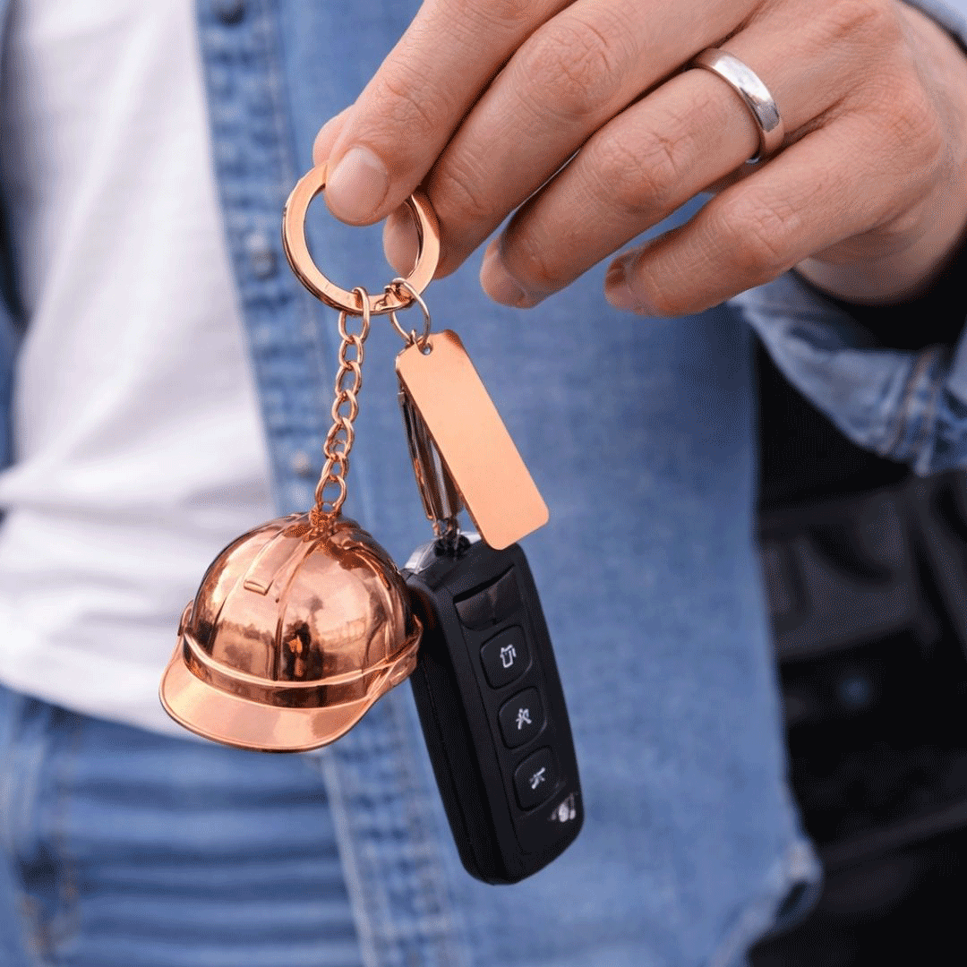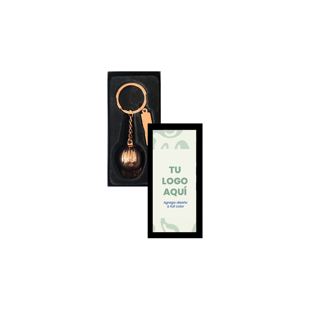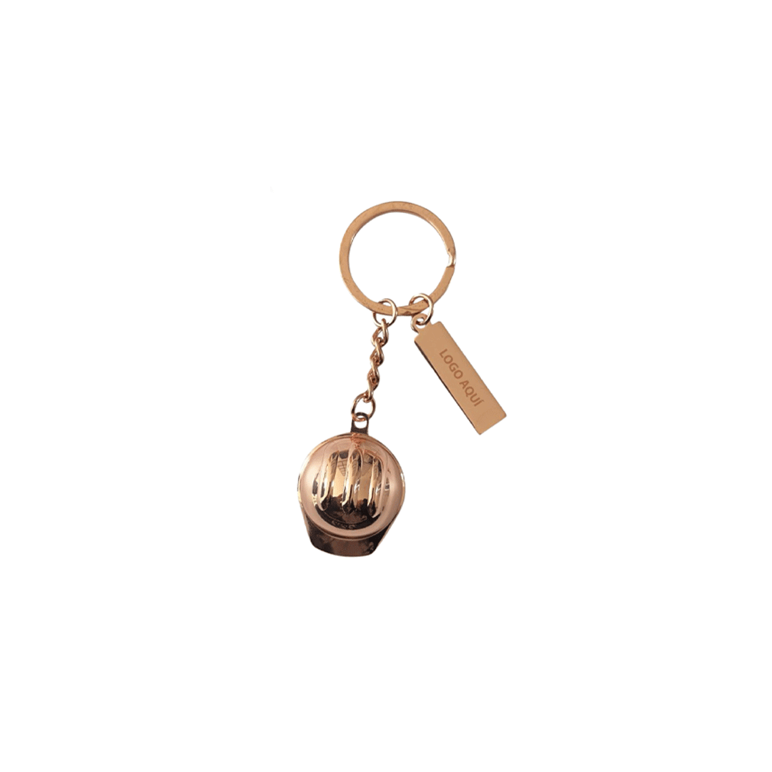 Descripción: Llavero cobrizado con forma de casco, incluye una placa pequeña para aplicar logo del cliente a 1 color. Presentación: Caja negra con encajes. Adhesivo a full color personalizado por cliente.