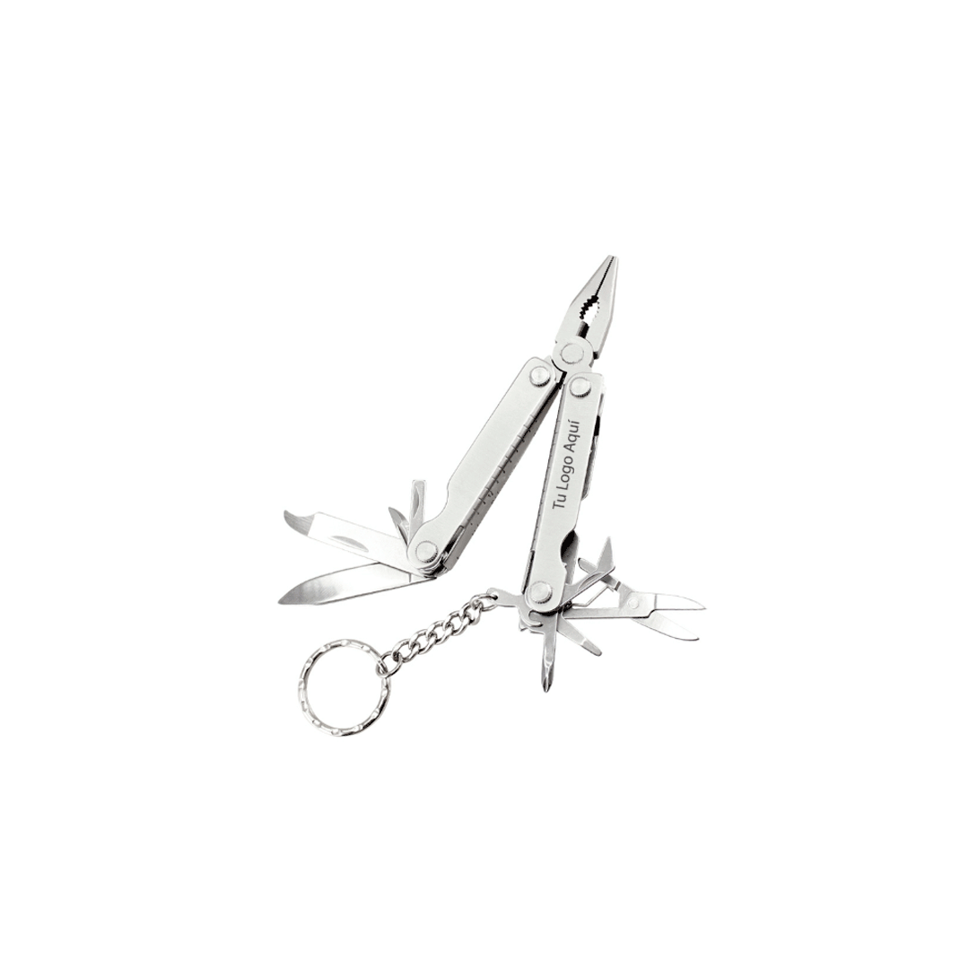 Multiherramienta metálica plegable de 10 funciones, con llavero. Incluye mini-regla en cm y pulgadas. con estuche de polyester negro. Tamaño: 6.5 x 2.3 x 1 cm. Logo en grabado laser. Presentado en bolsa de algodon de 15x10cm con logo a un color.
