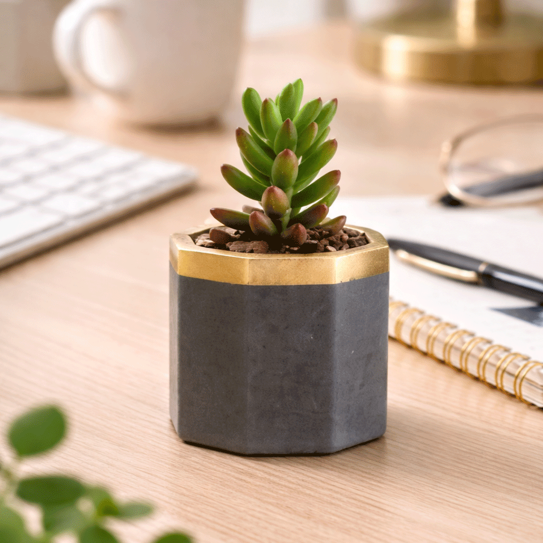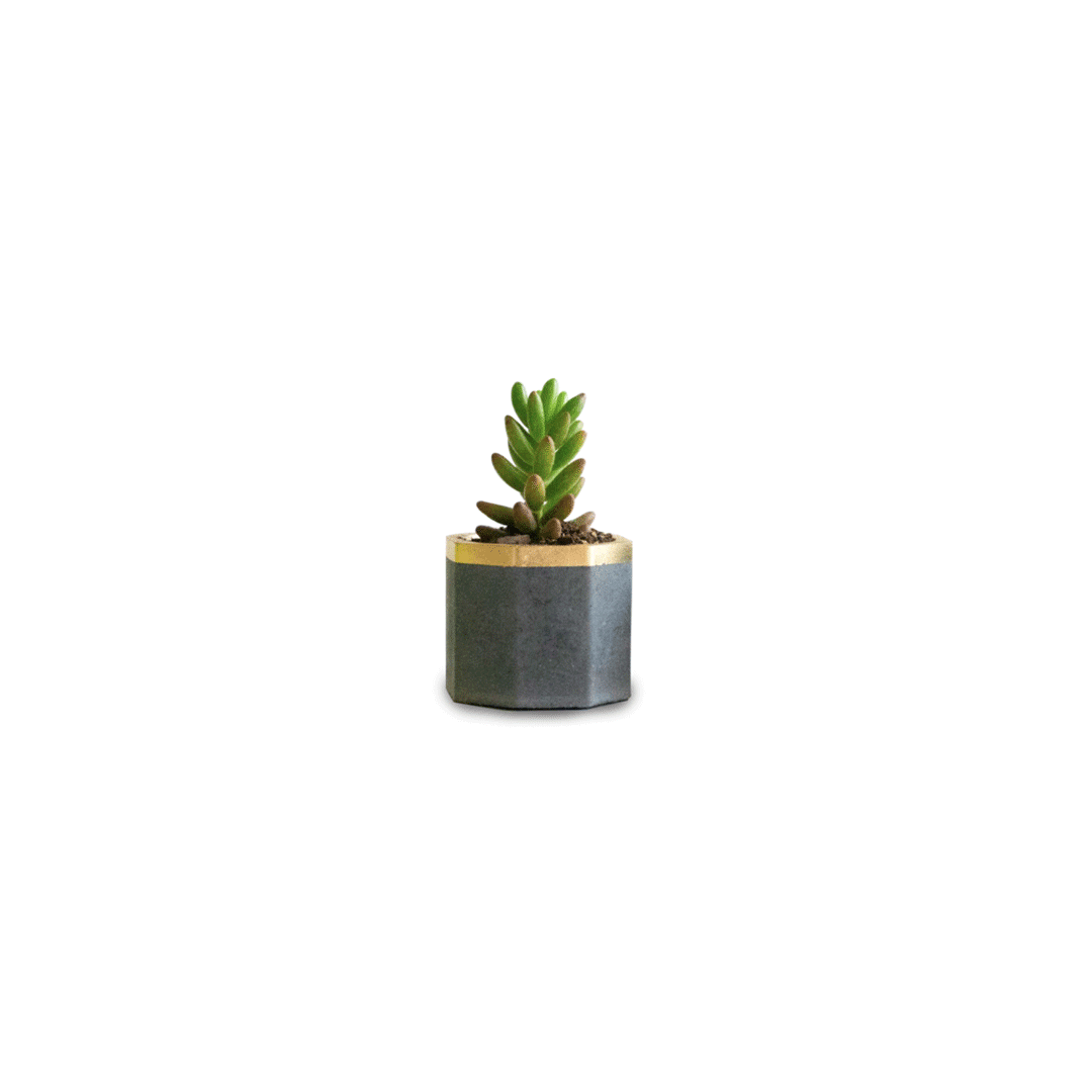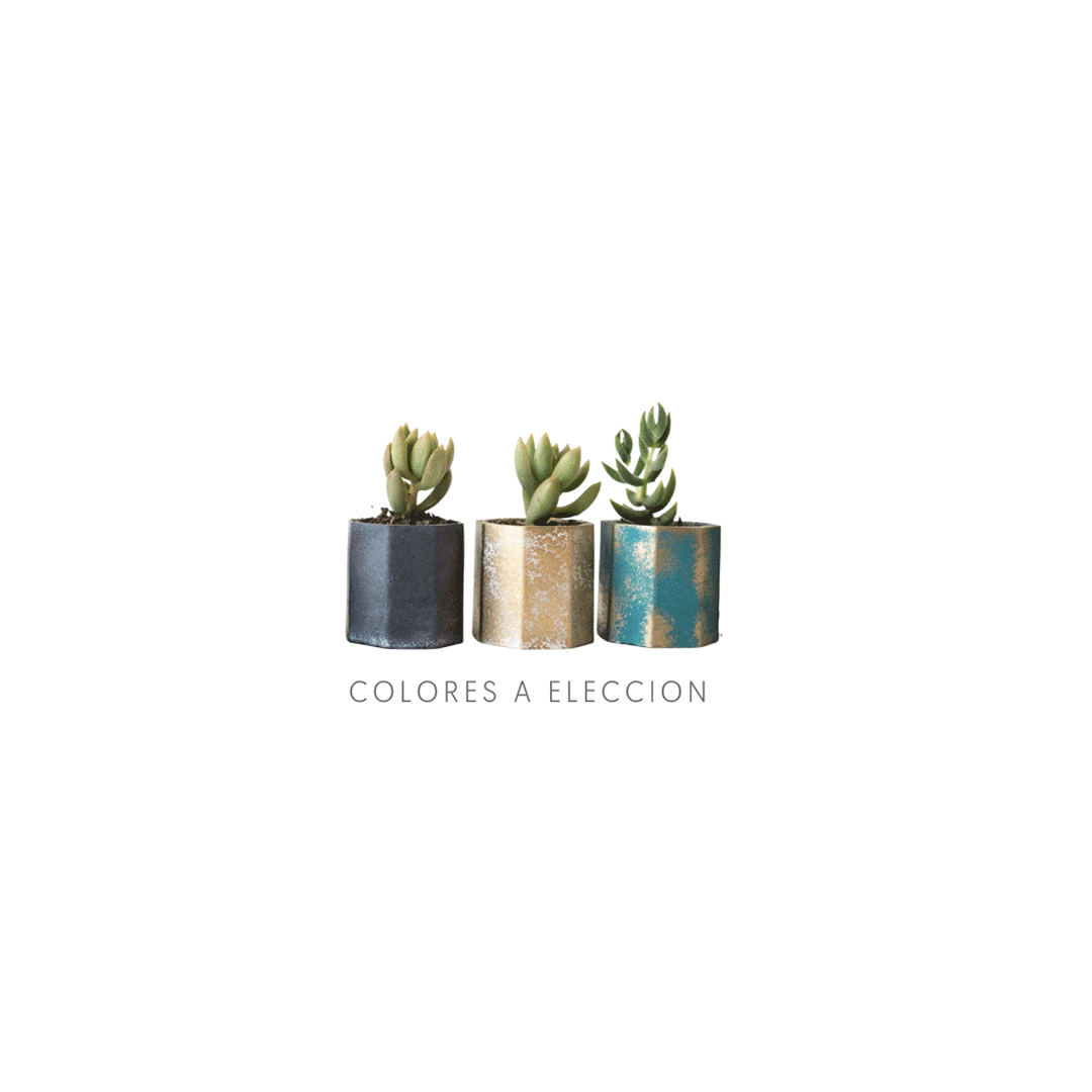 Macetero de concreto pintado a 2 tonos con suculenta. Medidas 4,5 x 4,5 x 5 cm de alto. Presentado en caja Kraft personalizada