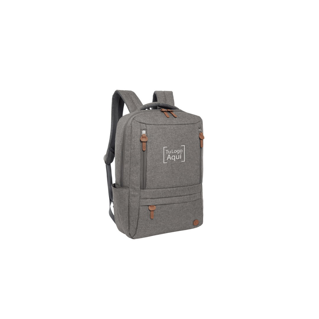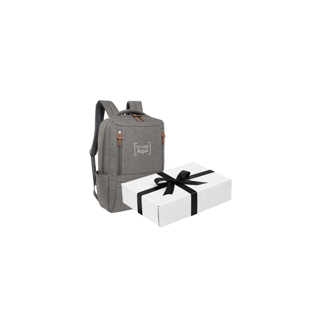 Descripción: Mochila portanotebook de hasta 15,6 pulgadas. Compartimento principal con bolsillos organizadores de accesorios y bolsillos acolchados para notebook y tablet con cinta y cierre de velcro. 3 bolsillos delanteros con cierre y 1 bolsillo lateral. Asa y correas acolchadas y reforzadas, hebillas plásticas y cierres metálicos con tiradores en poliuretano. Espalda acolchada. Incluye tira para sujetar la mochila en la manija extensible de un equipaje de mano. Medidas: 30 x 42 x 10 cm. Capacidad: 12 litros. Logo aplicado a full color. Presentación: Caja kraft de lujo 40x30x10cm con logo y/o gráfica a un color.