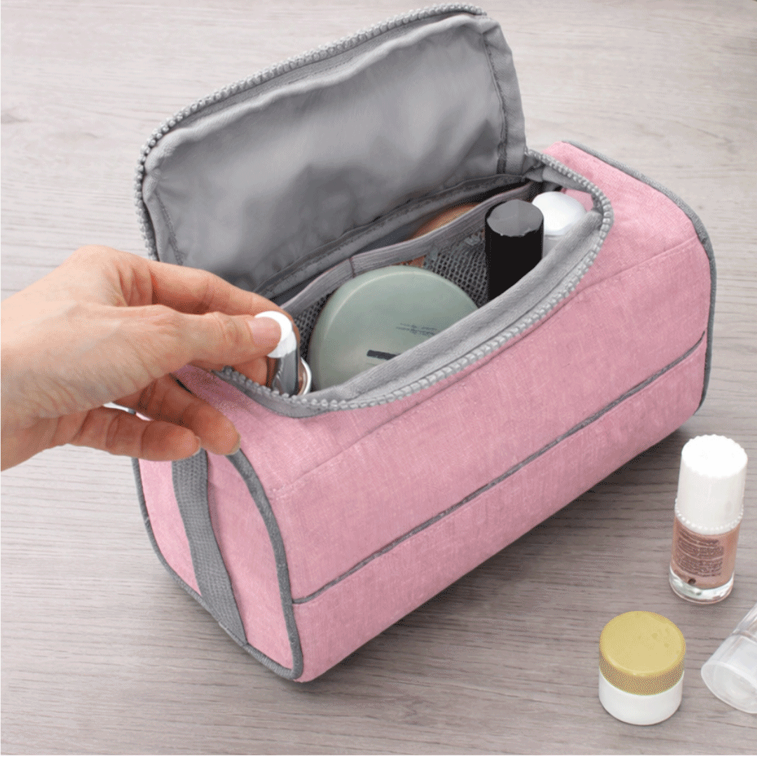 Necessaire con tapa 22 x 10 x 12 cm. Poliéster 300D bicolor. Organizador con dos bolsillos internos de red elastizados, tapa acolchada con cierre plástico color gris y asa lateral de tela color gris para transportar con logo a 1 color. Presentado en caja Kraft rosa 25×20 cms con grafica corporativa a 1 color o cinta de regalo.