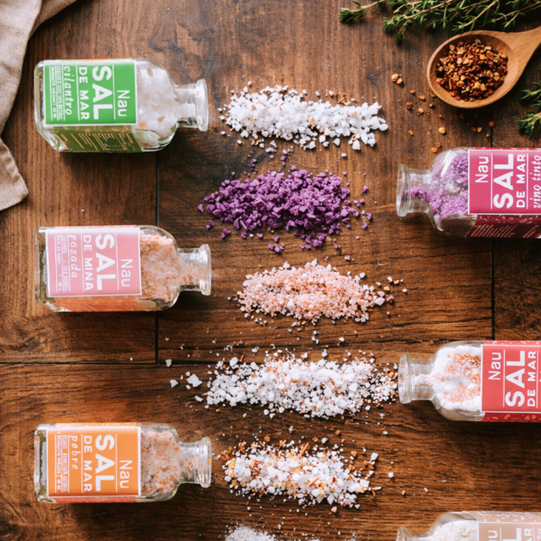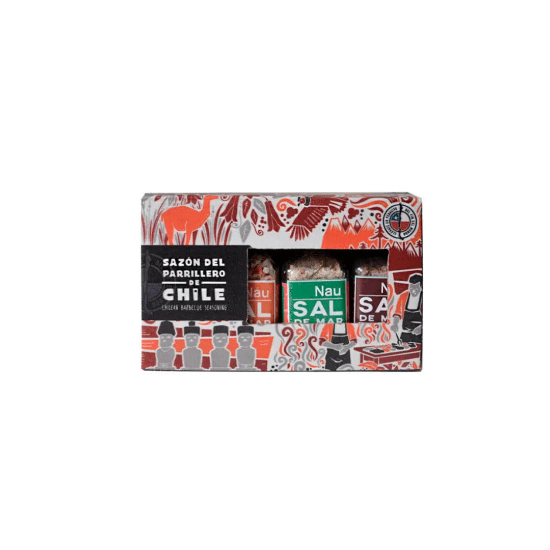Compuesto por 4 botellas de 35 gramos cada una, con una linda caja con motivos chilenos que contiene: sal de mar al vino tinto, sal de mar al pebre, sal de mar con chimichurri y sal de mar al BBQ. Presentado en caja kraft de 20x14cm con gráfica y/o logo a un color.