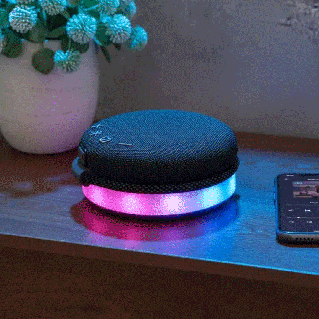 Descripción: El parlante Fullmoon cuenta con luces led multicolor y una correa ajustable para que lo lleves a donde quieras. Está fabricado en ABS y silicona, con un recubrimiento de tela. Su capacidad es de 1800 mAh, ideal para acompañarte en tu día a día y disfrutar de tu música en cualquier ocasión. Kingtech. Logo aplicado a un color. Presentación: Caja de cartón color negro Adhesivo a full color personalizado por cliente.