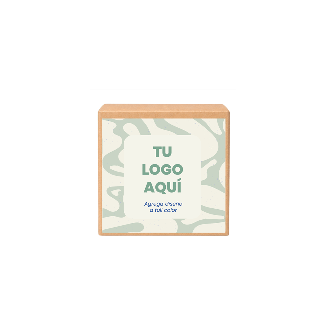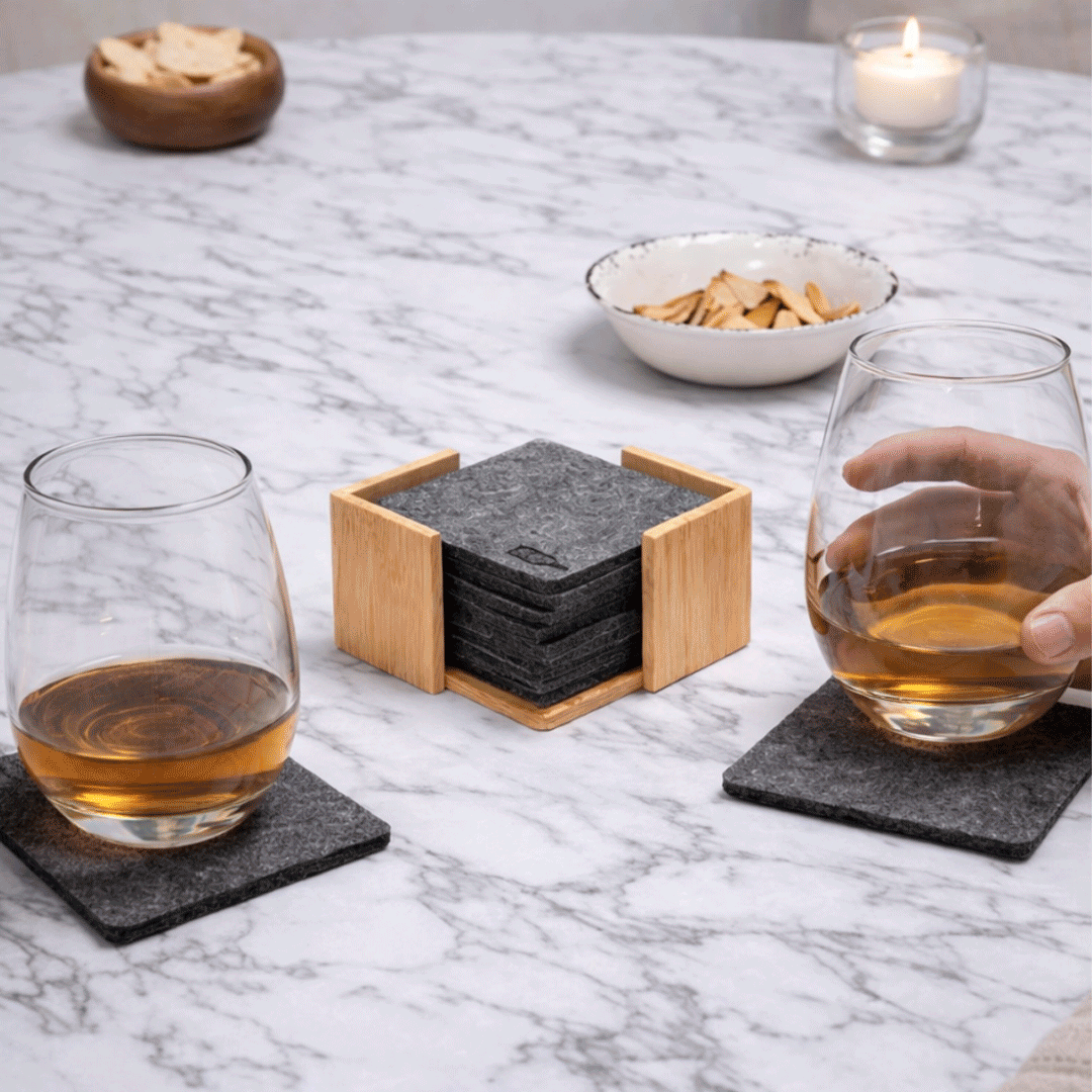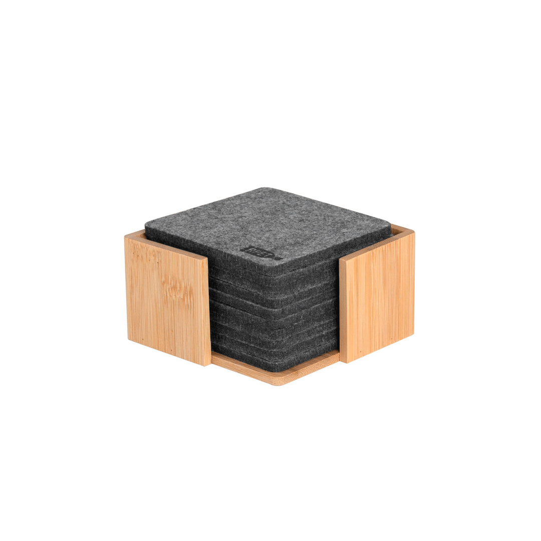 Set de 10 posavasos 9 x 9 x 0,5 cm. El primero lleva impreso el sello RPET, Fieltro de plástico reciclado. Soporte de bambú de 10,5 x 10,5 x 5,5 cm con logo grabado en madera. Presentado en caja kraft con adhesivo full color personalizado por el cliente.