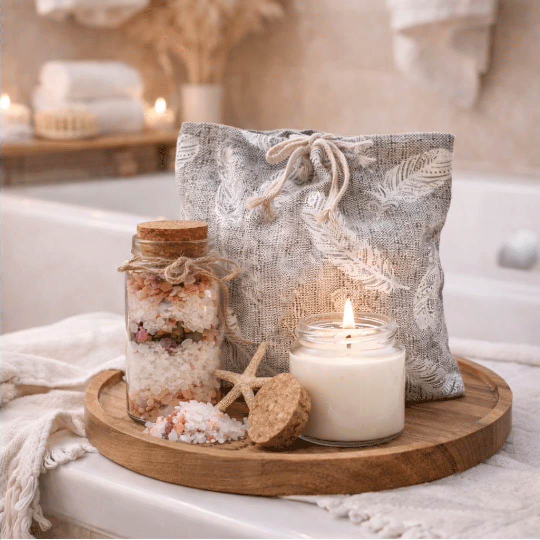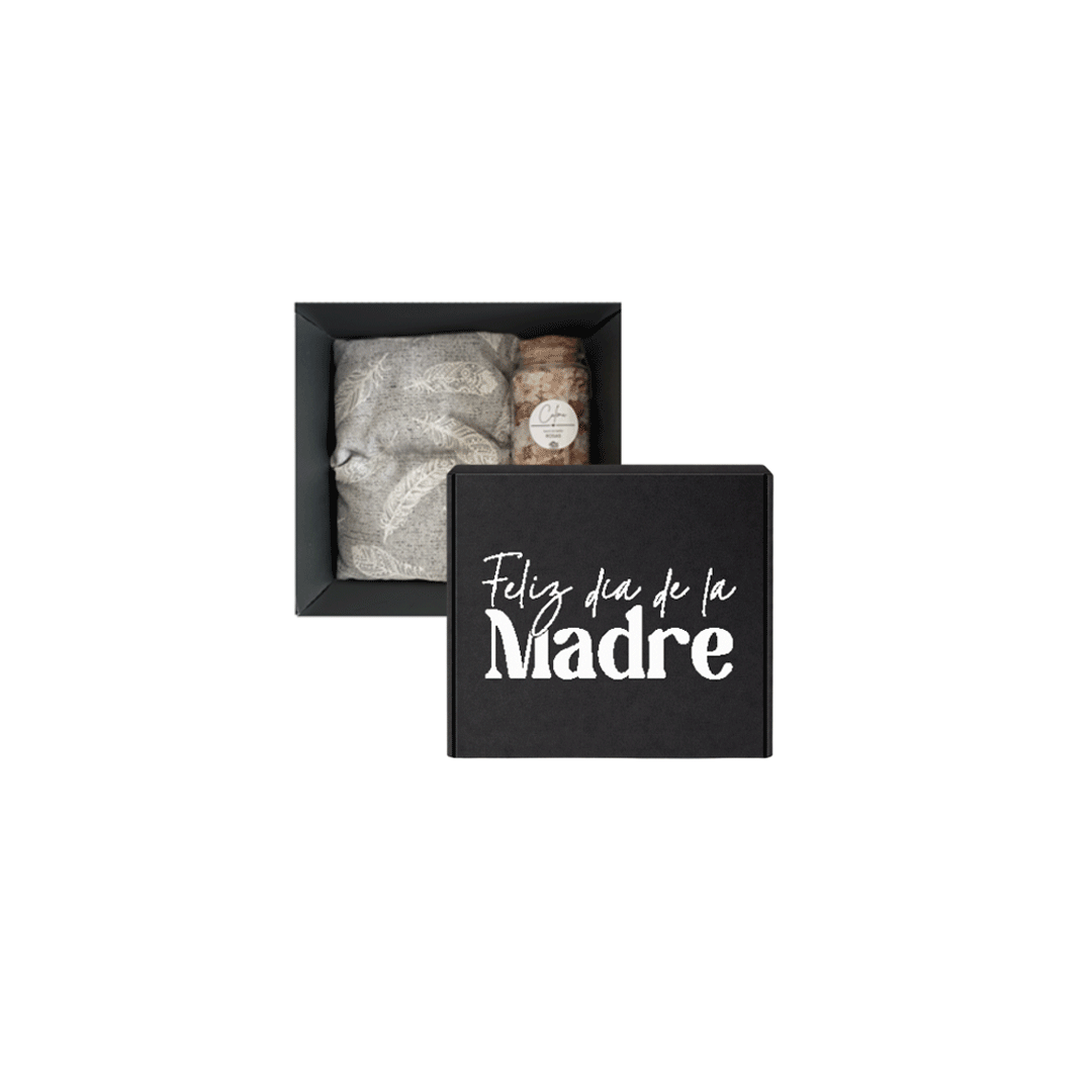 Guatero de semilla con piedra de cuarzo, semilla delinaza y flor de lavanda y manzanilla 400 gr, tamaño20 x 17 cms con logo + Vela aromática en frasco de vidrio con logo a un color + Sal de baño natural 100 ml con logo de cliente. Presentado en caja negra 16×15 cms aprox con grafica corporativa a 1 color.