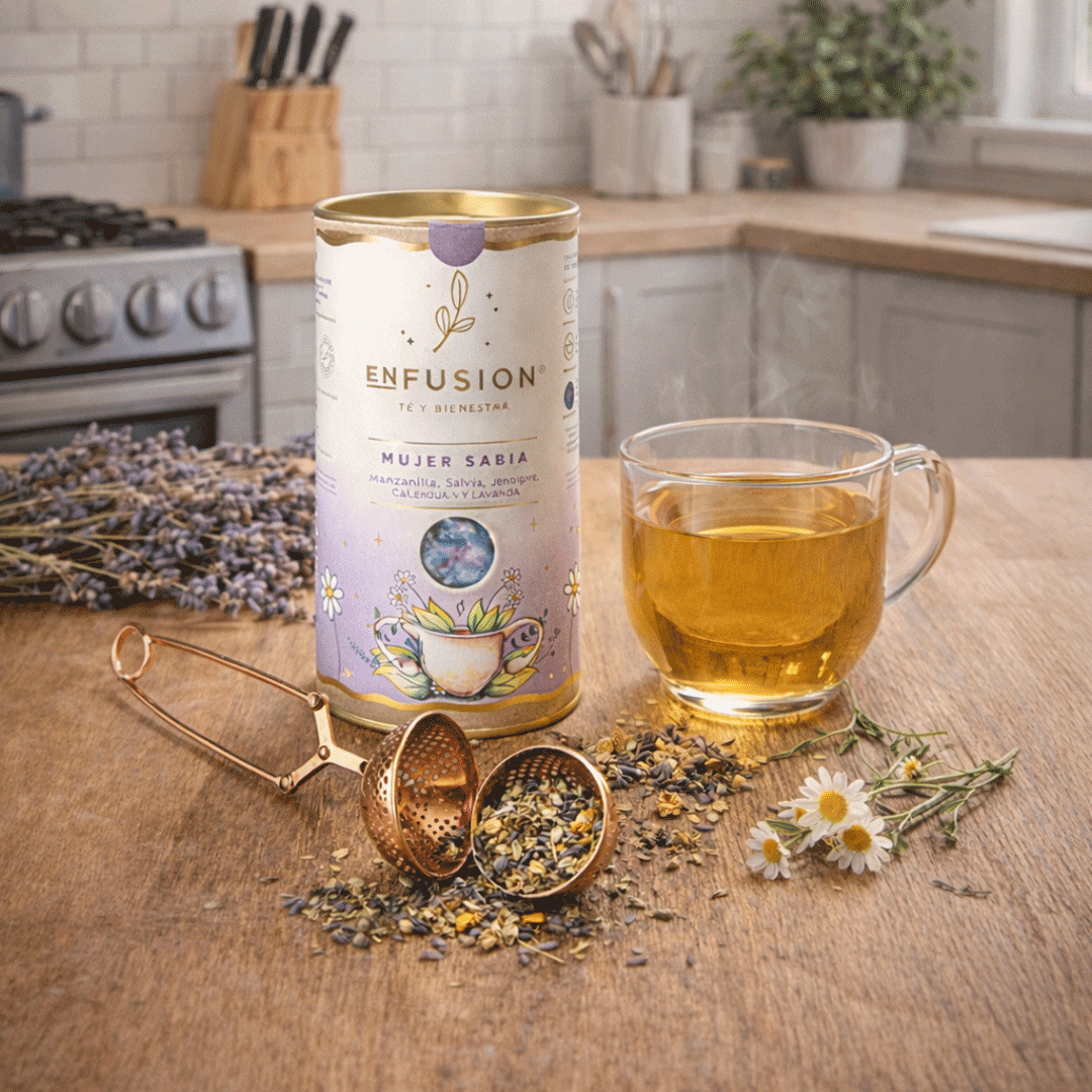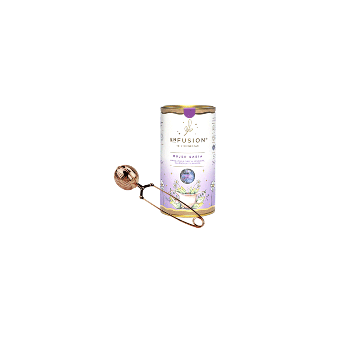 Infusor de pinza color cobre, adecuado para usar con hierbas, té u otras especies. Su tamaño lo hace fácil de llevar a cualquier lugar. + Un tarro de hierbas Enfusion, enfocados en el bienestar femenino. Presentado en caja negra premium de 16x16cm con logo y/o gráfica a un color.