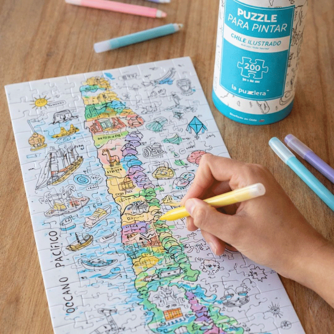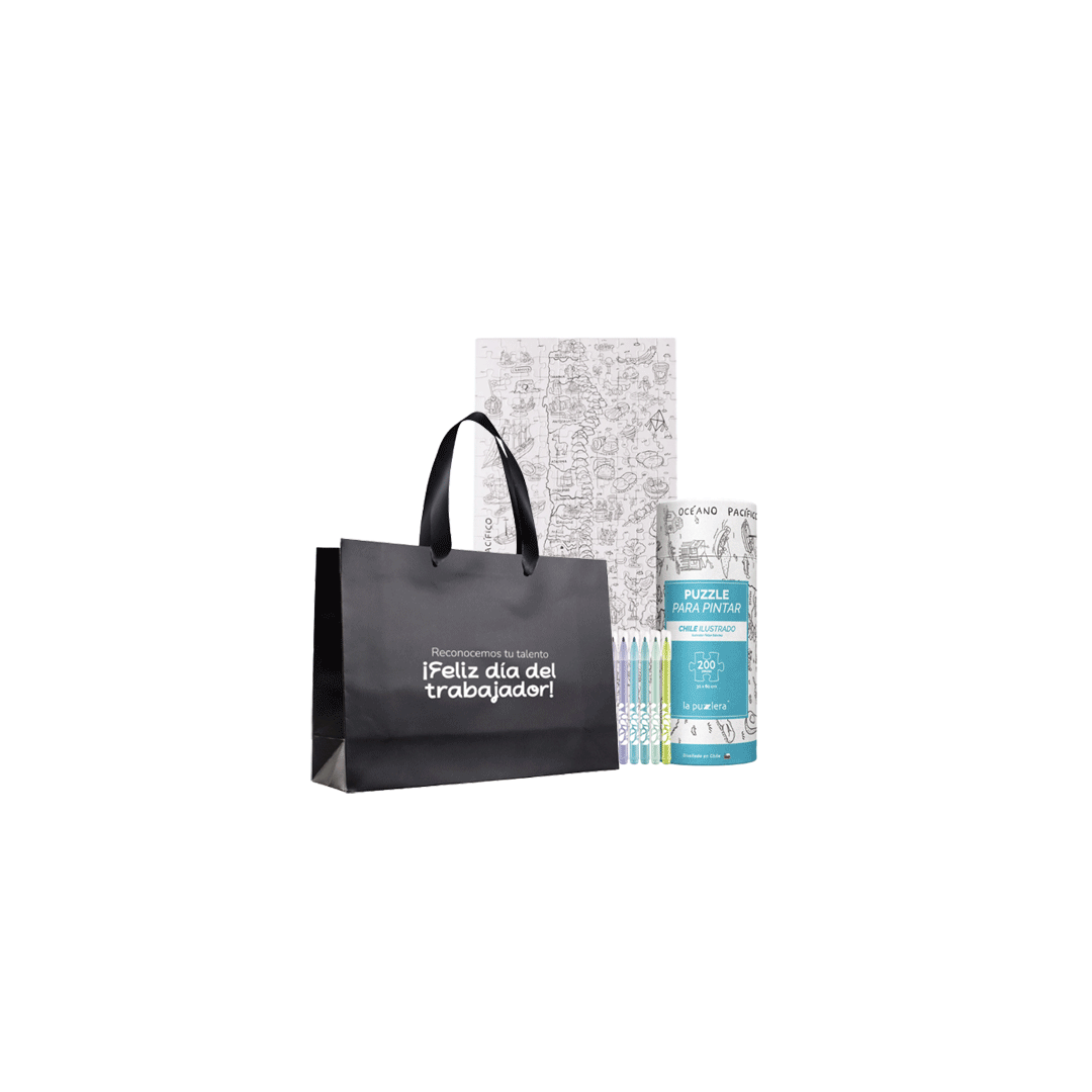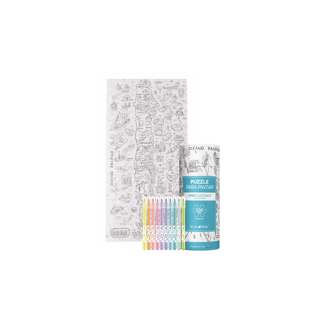 Descripción: Puzzle 200 piezas para pintar, ilustrado y creado en chile. Tamaño 60x30cm. Presentado en un cilindro temático de 25x12cm. Marcadores Pastel 10 unidades de Maped, son marcadores resistentes y lavables. Su punta redondeada de 2,8mm es resistente y antihundimiento. Presentación: Bolsa de lujo de 41x30x12cm con logo y/o grafica a 1 color.
