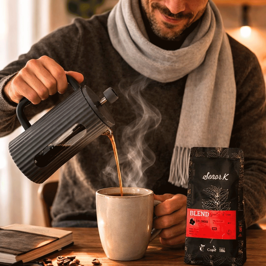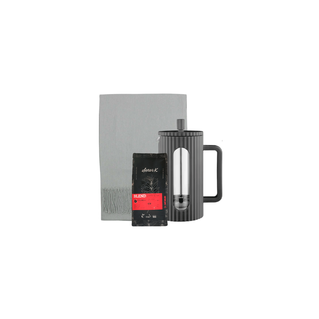 Incluye bufanda cashmere lisa de 200gr colores a eleccion segun stock + Cafetera gris de 600ml + Café molido blend de 100gr. Presentado en caja premium imantada de 25,5x20cm con logo y/o grafica a un color.