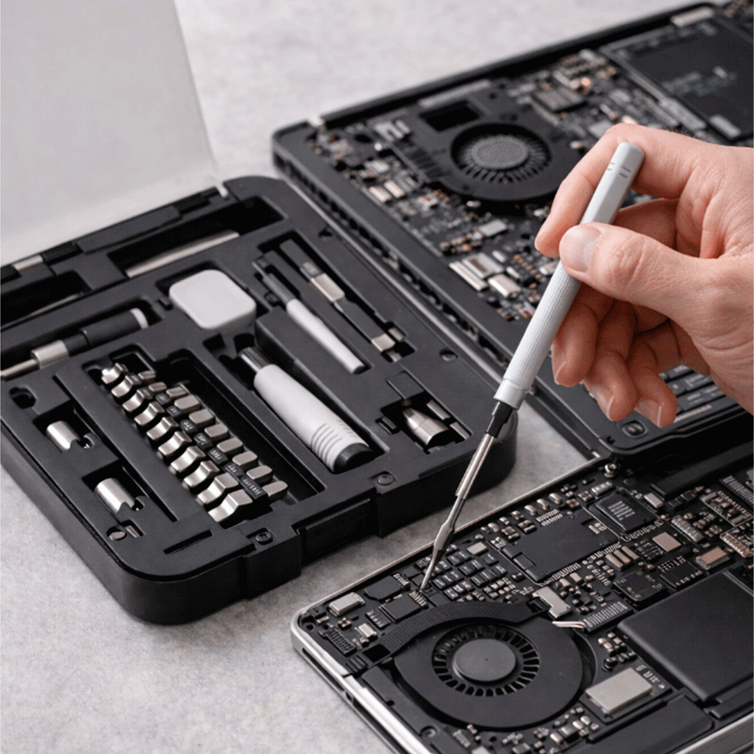 Set de herramientas, con en maletin de tapa transparente. Incluye: Llave allen, linterna, metro extensible, destornillador de puntas intercambiables. Medidas: 22 x 16 x 2,7 cm. Incluye logo a un color en tapa transparente. Presentado en caja kraft con adhesivo personalizado por cliente.