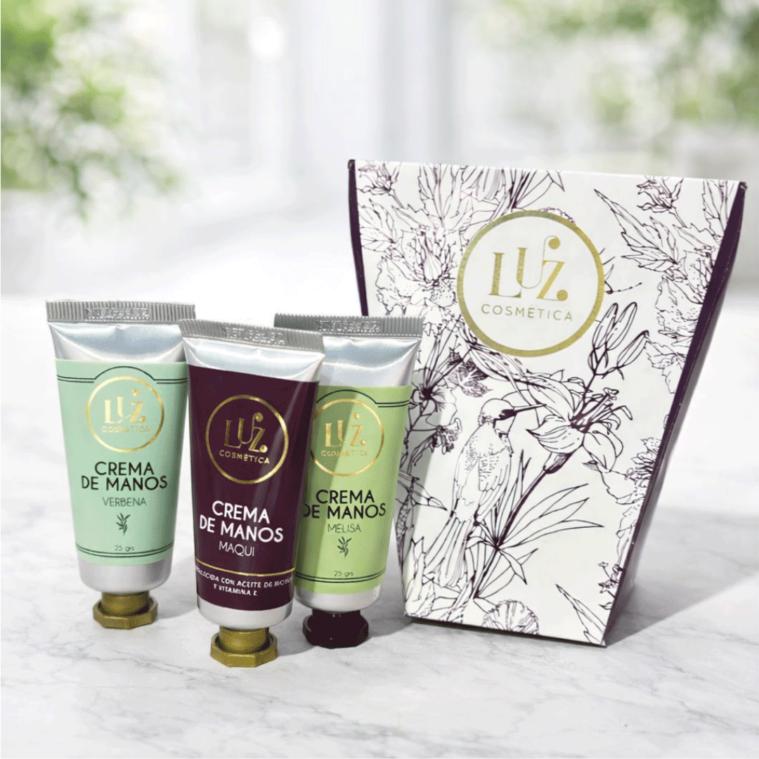 Caja con 3 cremas 25 gr. para manos sabores tropical; Crema Maqui- Murtilla-Calafate. Presentado en caja con logo sticker. Diseño de caja puede variar según temporada.