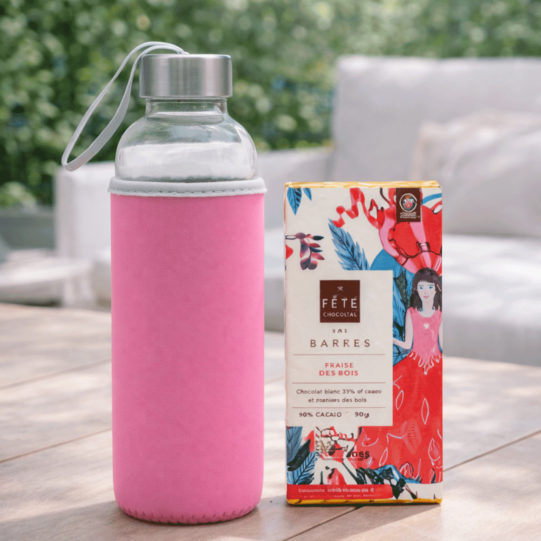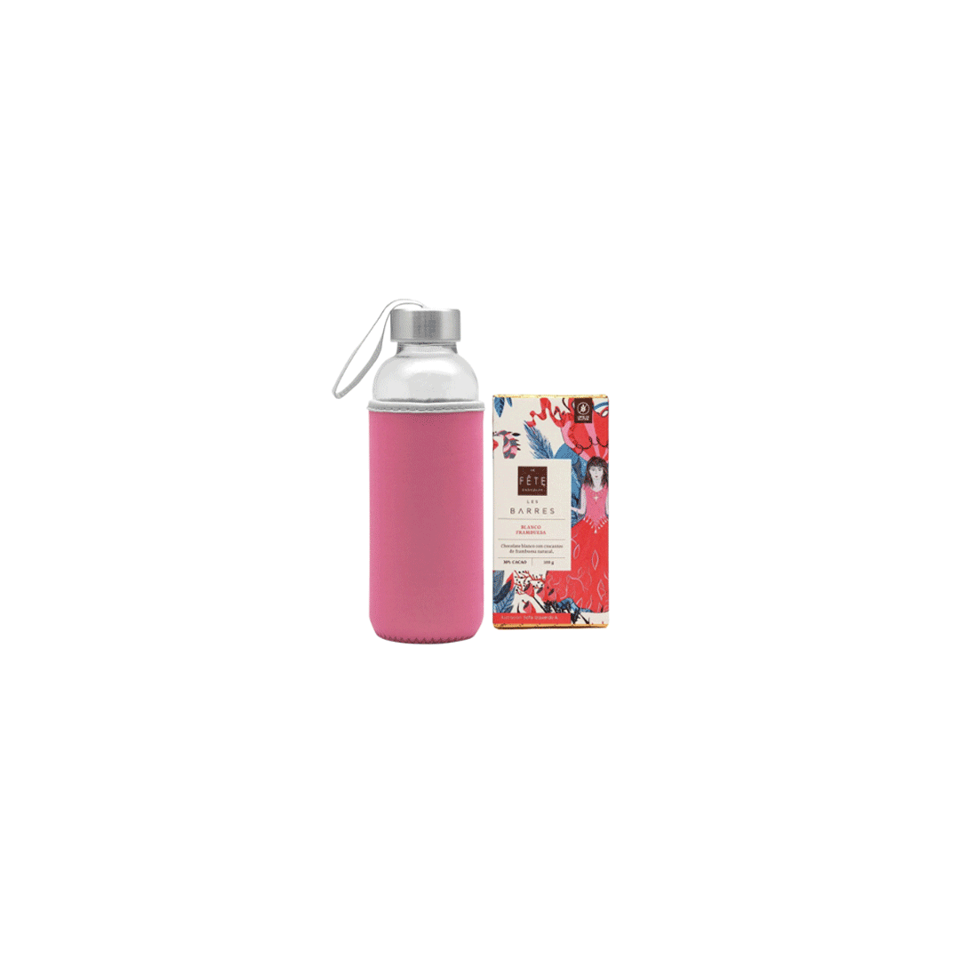 Botella de vidrio 440 ml. Funda de neopreno para mantener la temperatura de las bebidas con tapa de acero inoxidable con tira de tela con logo a 1 color en la funda + Barra de chocolate La fete 100 gr. Presentado en bolsa crea de 30 x 20 cm con grafica corporativa a 1 color.