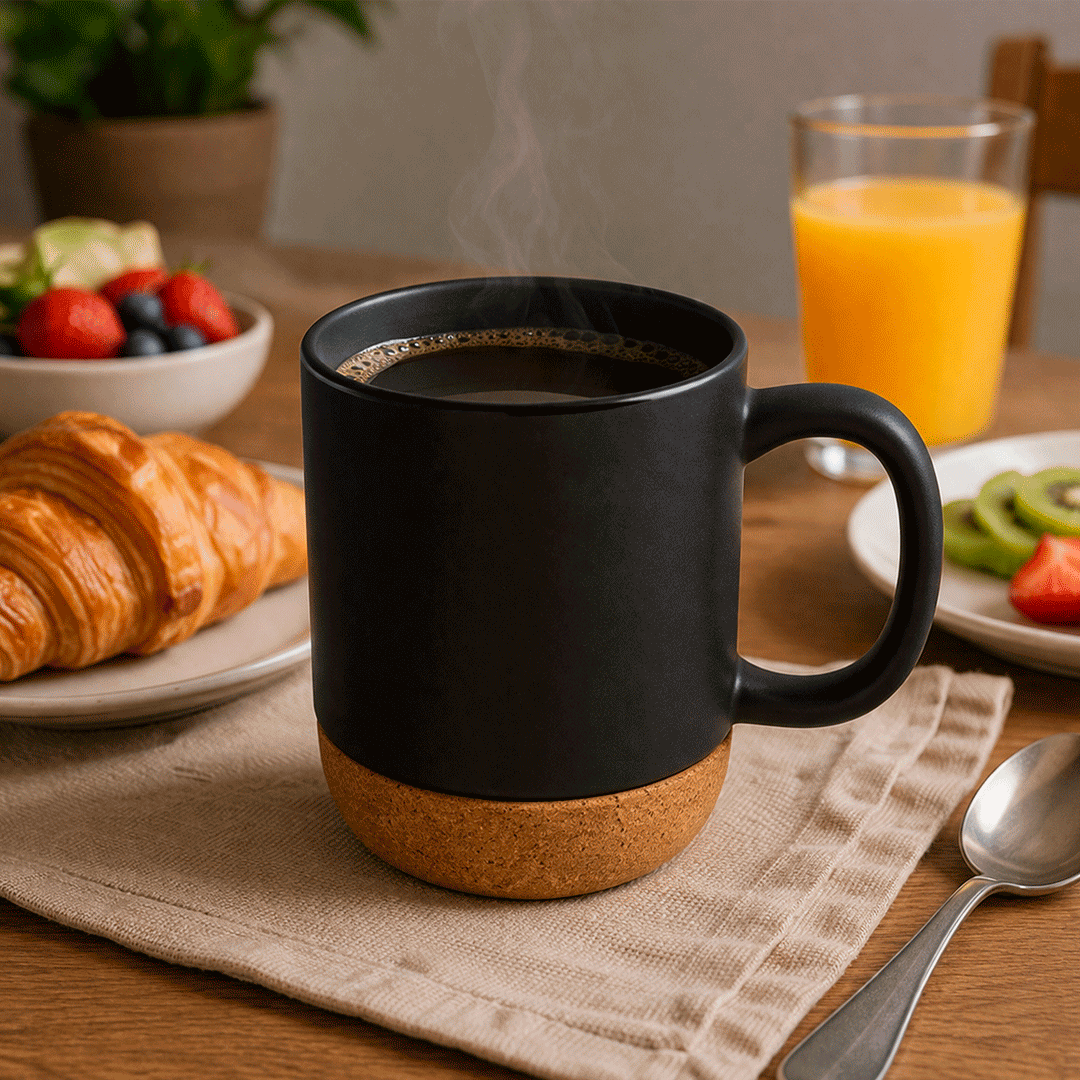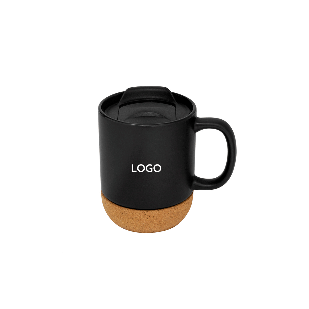 Taza con tapa. Tapa plástica a presión color negro con anillo de silicona. Base de corcho. Pintura con acabado mate. Producto apto para microondas siempre retirando la base de corcho. Medidas: 11,8 x 9,3 x 11,5 cm. Capacidad: 380 ml. Incluye logo a full color. Presentado en caja kraft con adhesivo a color personalizado por cliente.