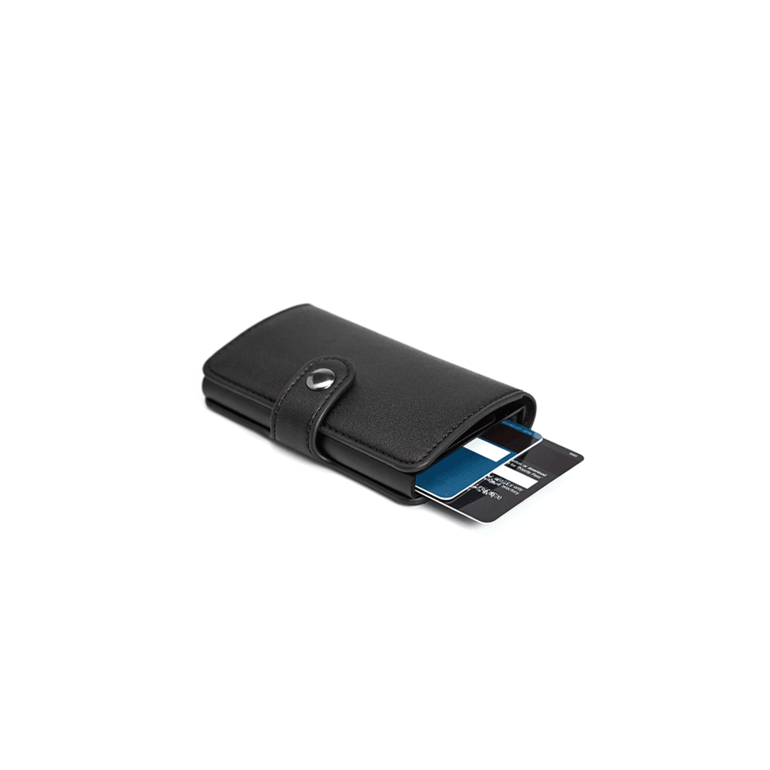 Tarjetero confeccionado en PU, diseñado para evitar lectores RFID que puedan poner en peligro la seguridad de tu documentación, tarjetas de crédito o débito, información bancaria, licencias de conducir RFID u otro tipo de tarjetas RFID. Capacidad de hasta 6 tarjetas con logo a 1 color.