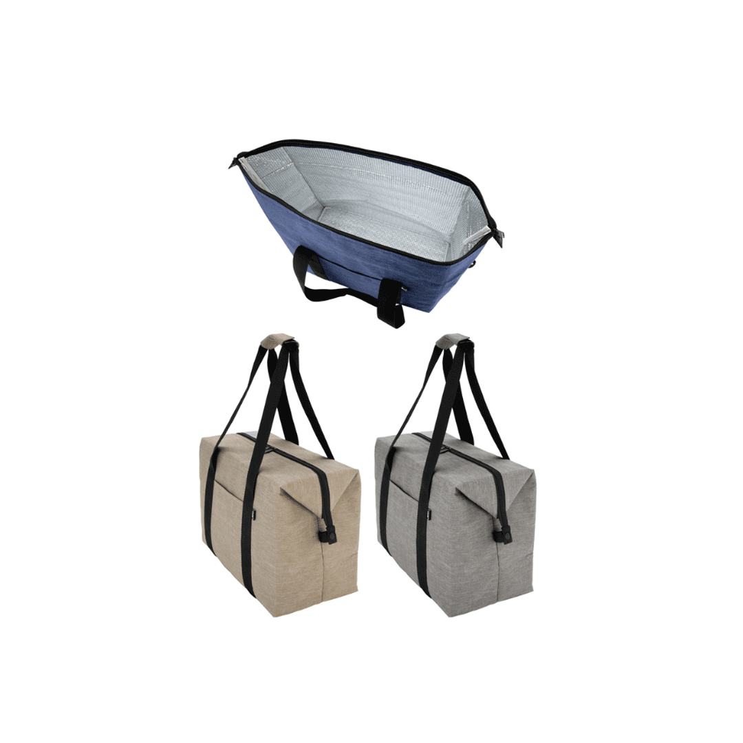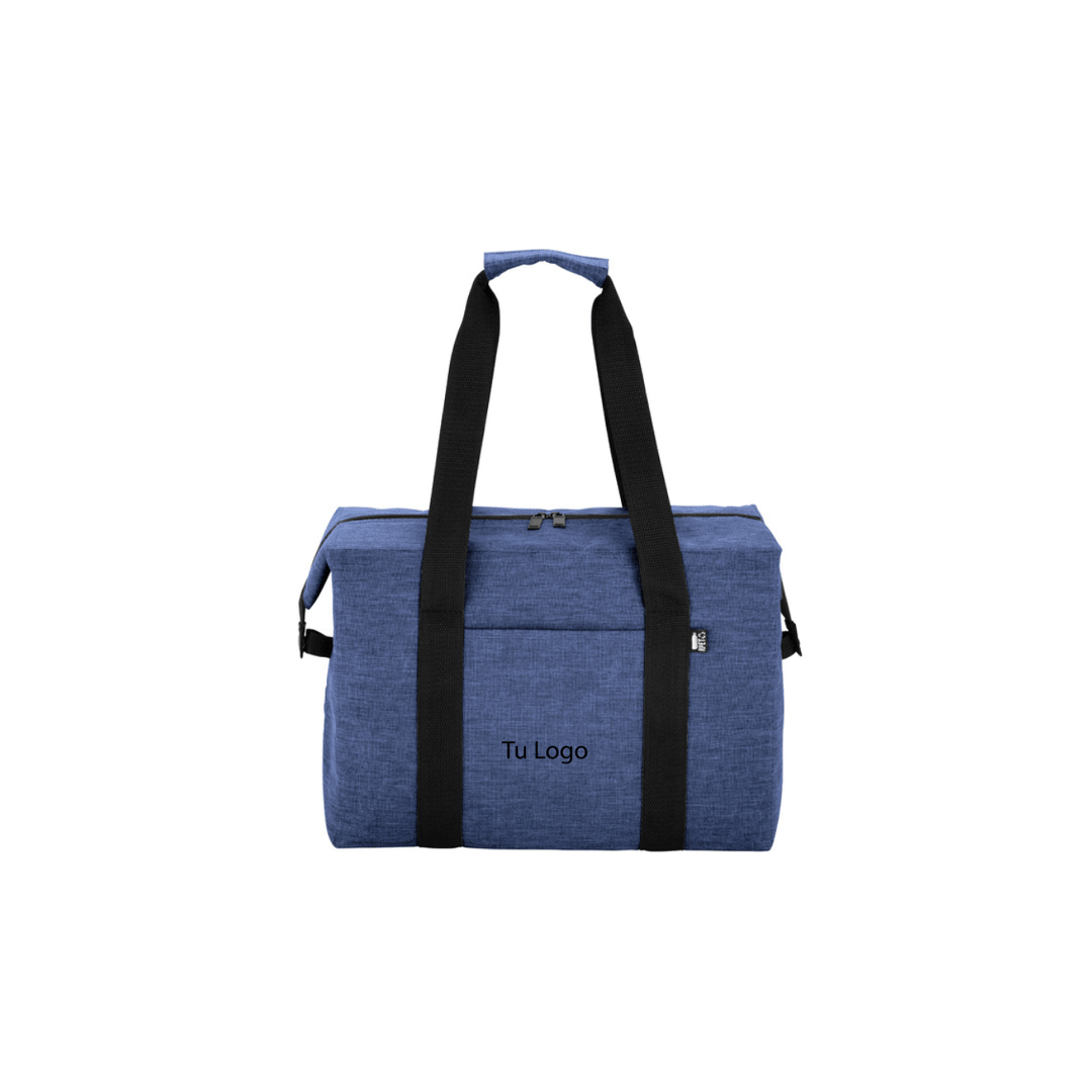 Bolso térmico. Cierre posterior con dos tiradores. Hebillas metálicas en los laterales que permiten cambiar su formato a prisma. Bolsillo frontal. Dos asas con refuerzo de velcro. Medidas: 37,5 x 20 x 26 cm. Capacidad: 19 litros. Incluye logo a full color. Presentado en bolsa kraft blanca de 41x30cm con gráfica y/o logo a un color.