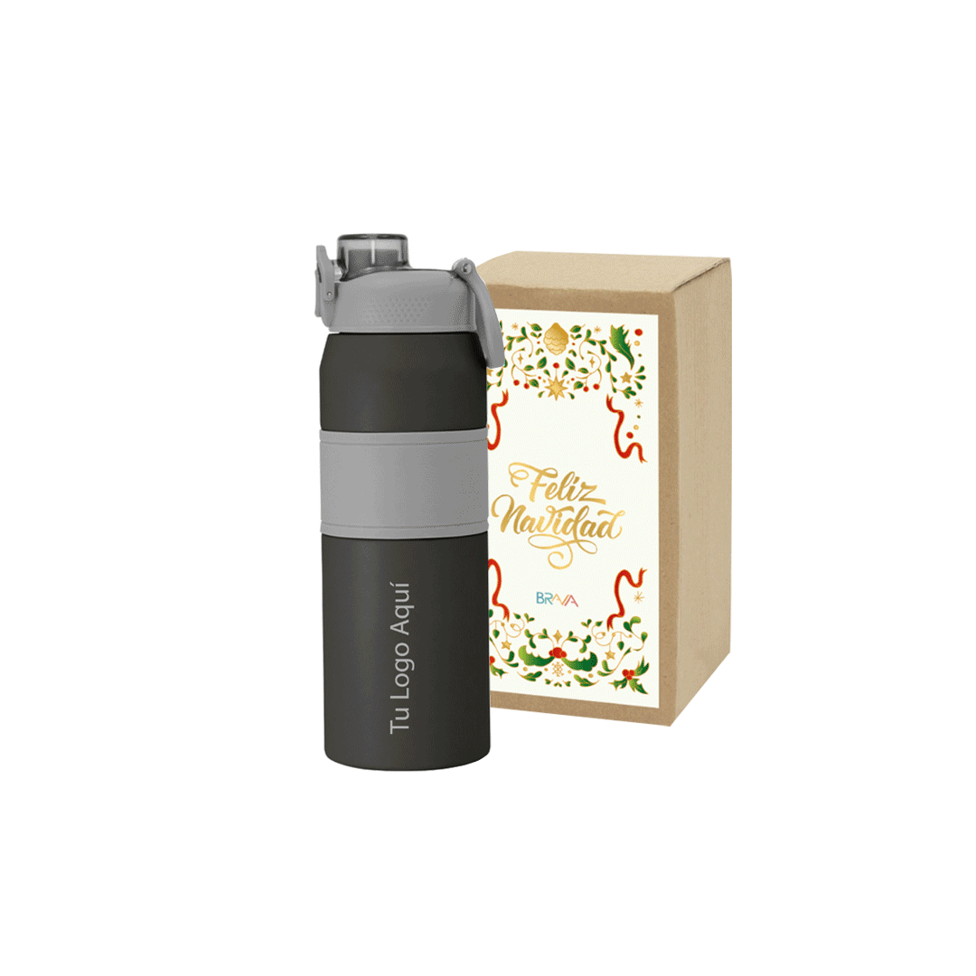 Botella deportiva con doble pared 840 ml, sellada al vacío, de acero. Pintura powder coat. Tapa plástica a rosca en color gris con anillo de silicona y manija plástica para su agarre, combinada con tapa rebatible en colores translúcidos. Boquilla con sorbete incluido. Grip de silicona color gris para mejor agarre. Mantiene 8hrs la temperatura de las bebidas calientes y frías. Logo en grabado laser. Presentado en caja kraft con adhesivo personalizado por cliente.