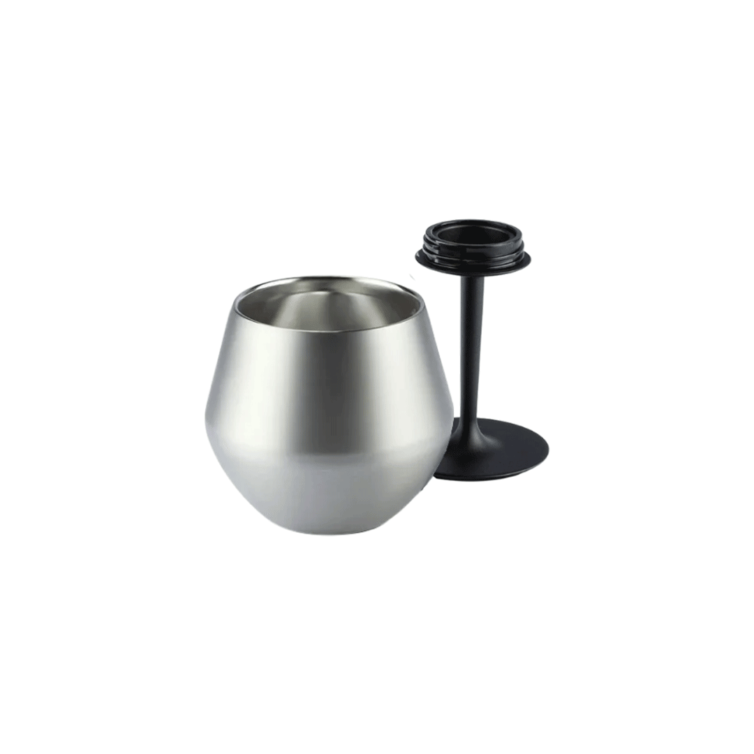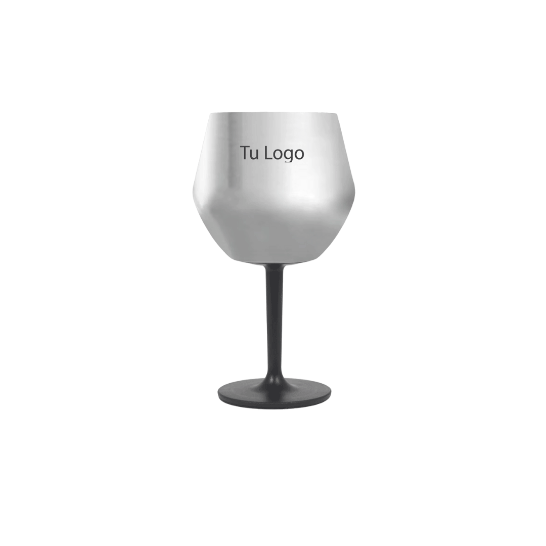 Copa plateada doble pared, con base desmontable de plástico color negro, puede ser usado como vaso o copa, incluye logo a un color. Presentado en caja kraft negra con adhesivo personalizado por cliente.