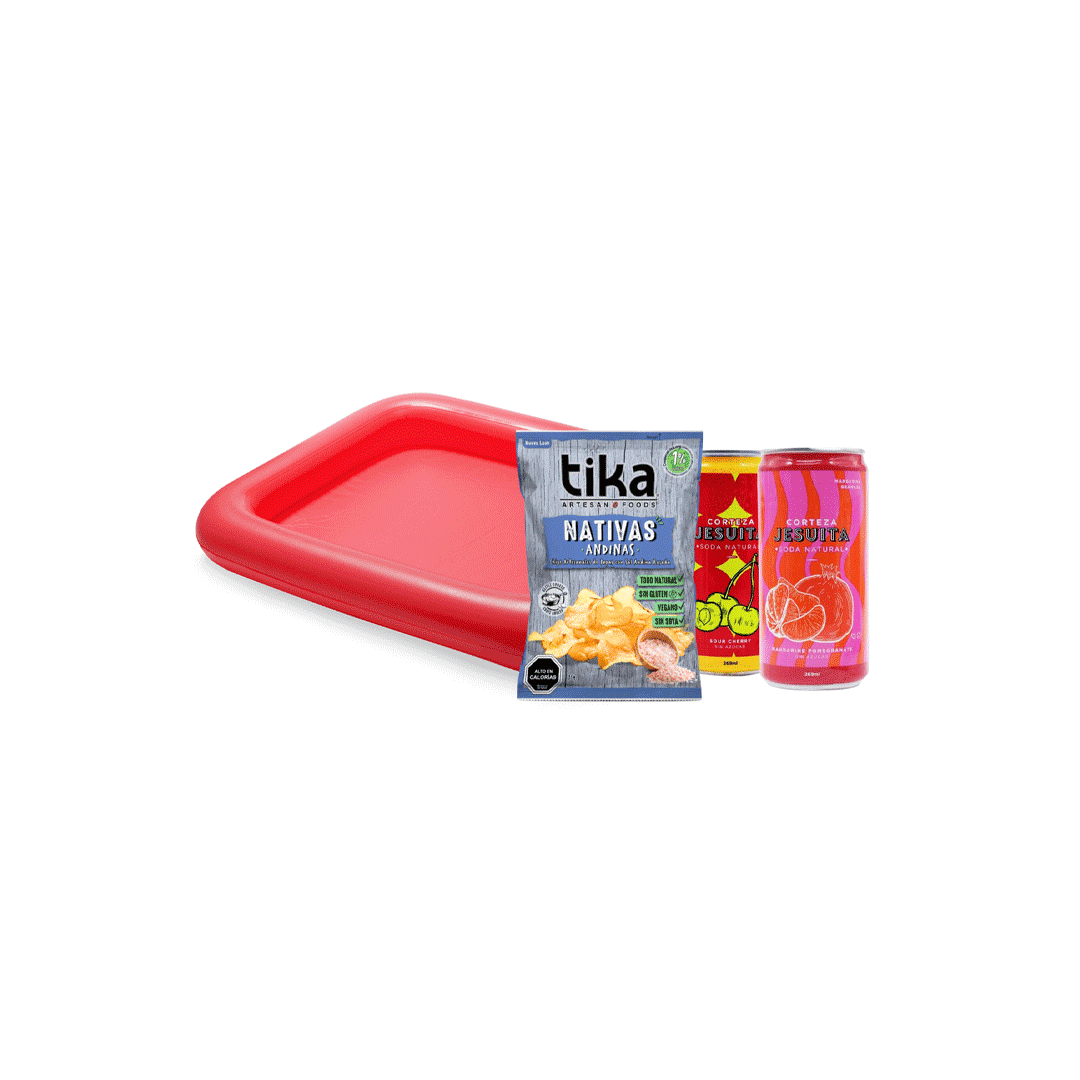 Original mesa inflable de PVC con bordes anticaída, disponible en 4 colores (elección según stock) tamaño 7cm x 60cm x 46cm, con logo a un color + 2 sodas naturales Corteza Jesuita sour cherry y mandarine pomegranate + Chips artesanales de papa Tika 35gr. Presentado caja kraft 25x20cm con logo y/o gráfica a un color, cinta a elección.