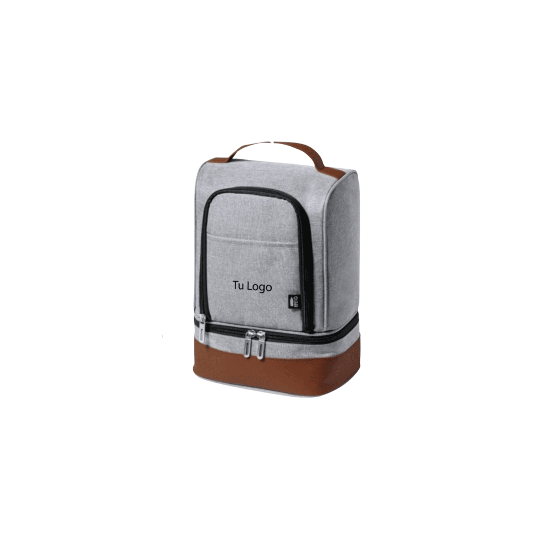 Nevera fabricada en resistente 600D RPET. Acabado en color gris, con base y asa de transporte en polipiel marrón. Incluye 2 compartimentos independientes, con cierre de cremallera y tiradores metálicos. 27 cm / 20 cm / 13 cm. Presentado en caja kraft premium de 30x20x10cm con gráfica y logo a un color.