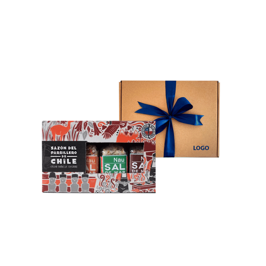Compuesto por 4 botellas de 35 gramos cada una, con una linda caja con motivos chilenos que contiene: sal de mar al vino tinto, sal de mar al pebre, sal de mar con chimichurri y sal de mar al BBQ. Presentado en caja kraft de 23x16cm con gráfica y/o logo a un color y cinta a elección.