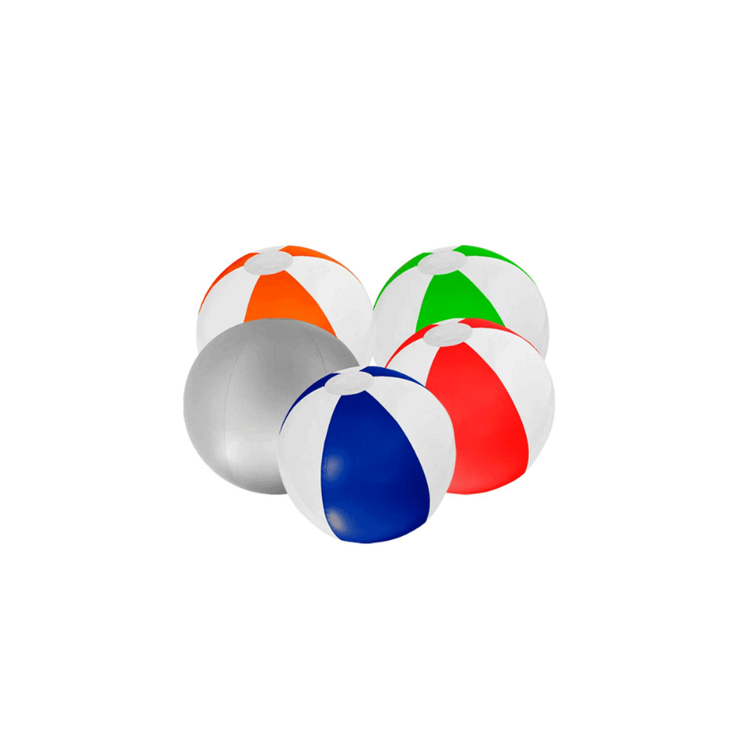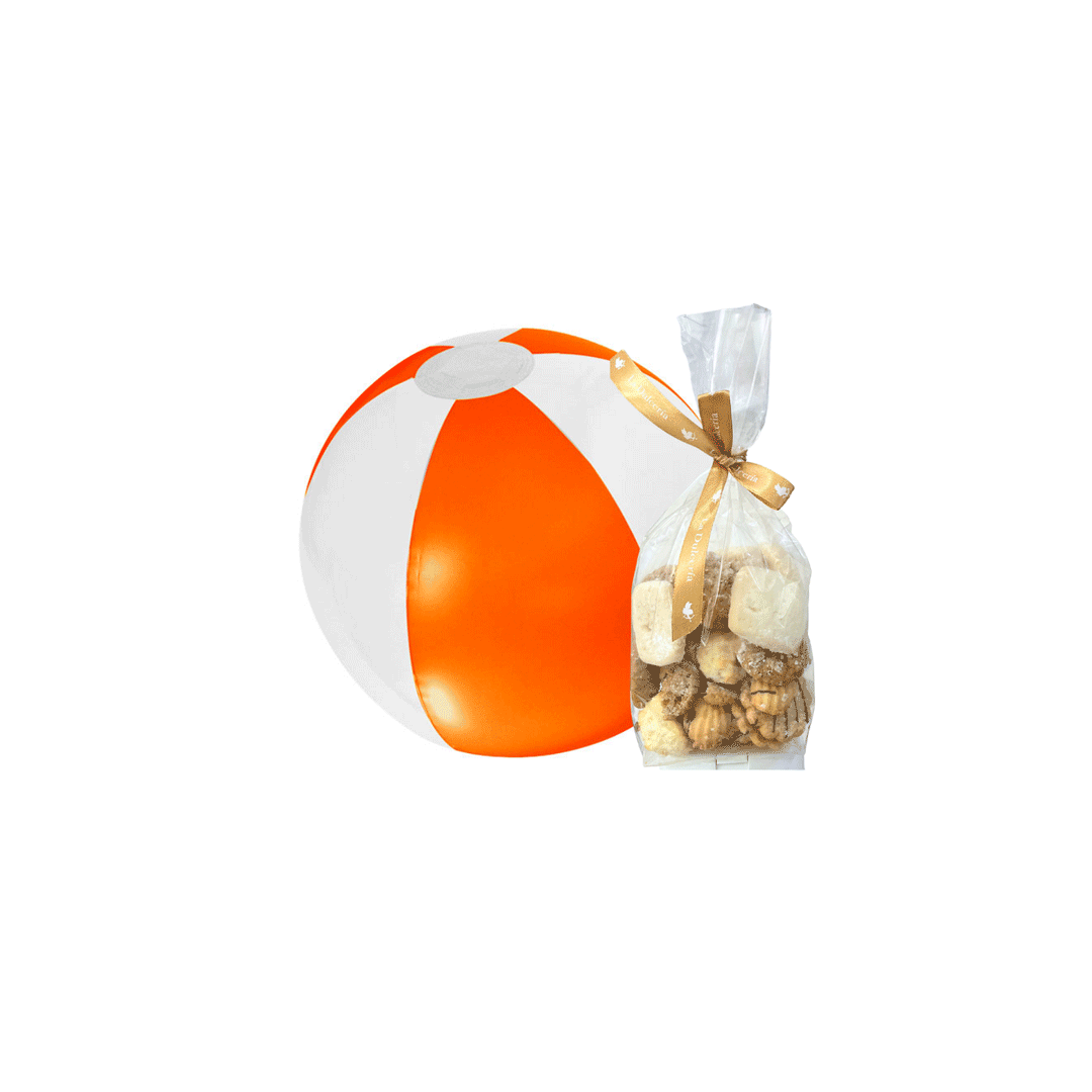 Pelota de Playa Inflable de PVC con 6 gajos. Se entrega desinflada dentro de una bolsita transparente de 15 x 15 cm. Tamaño: Desinflada 35 cm / Ø Inflada 27 cm. con logo a un color + Galletas surtidas de 200gr. Presentado en caja premium negra de 16x16cm con gráfica y/o logo a un color.