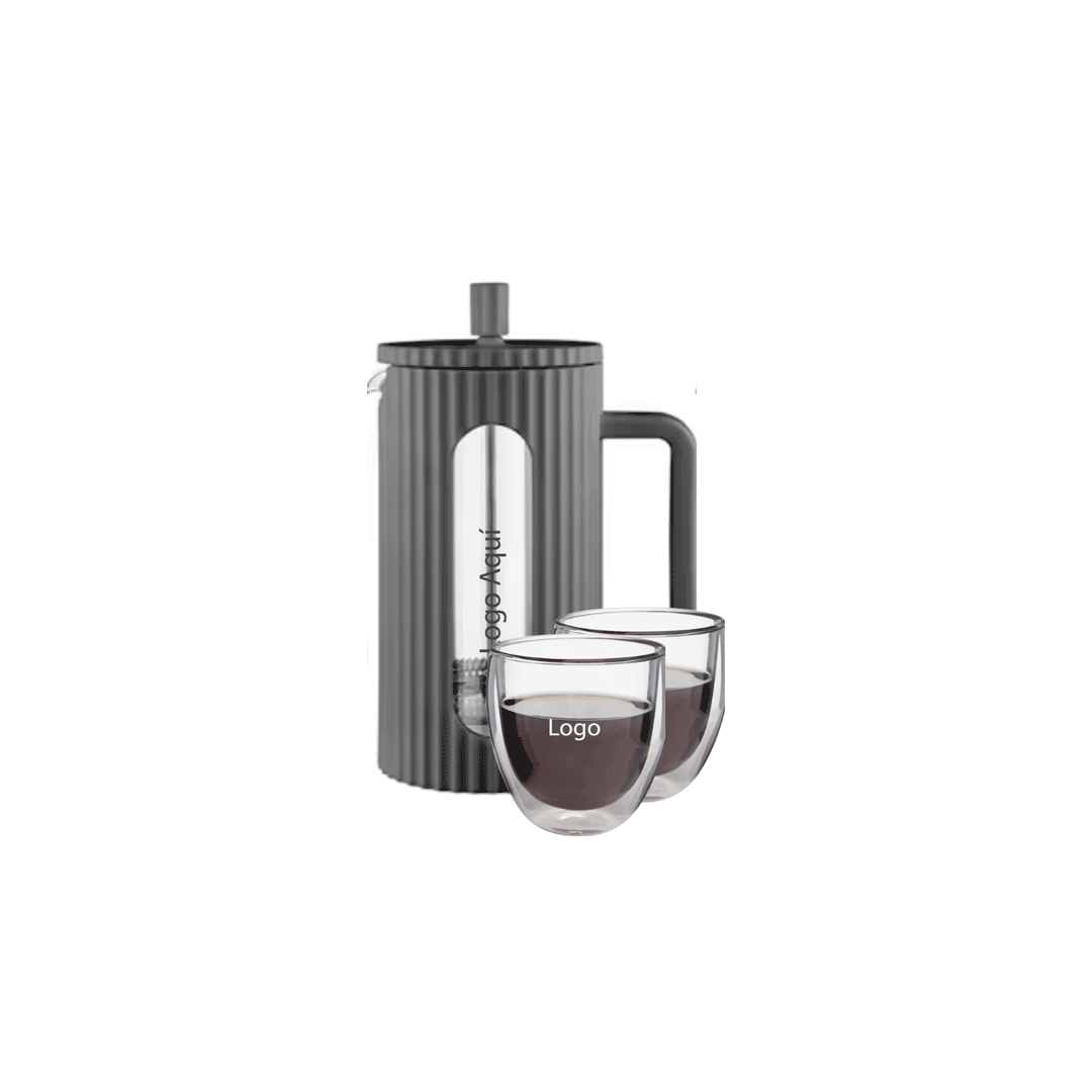 Cafetera francesa, diseño de rayas verticales 600 ml de vidrio de borosilicato, PP fresco con logo en DTF UV + Set de vasos doble pared. Apto para bebidas frías y calientes. Ø 8,3 x 10 cm. Capacidad 280 ml cada vaso. Vidrio. Presentado en caja negra de 25,5x20cm con logo y cinta a un color.