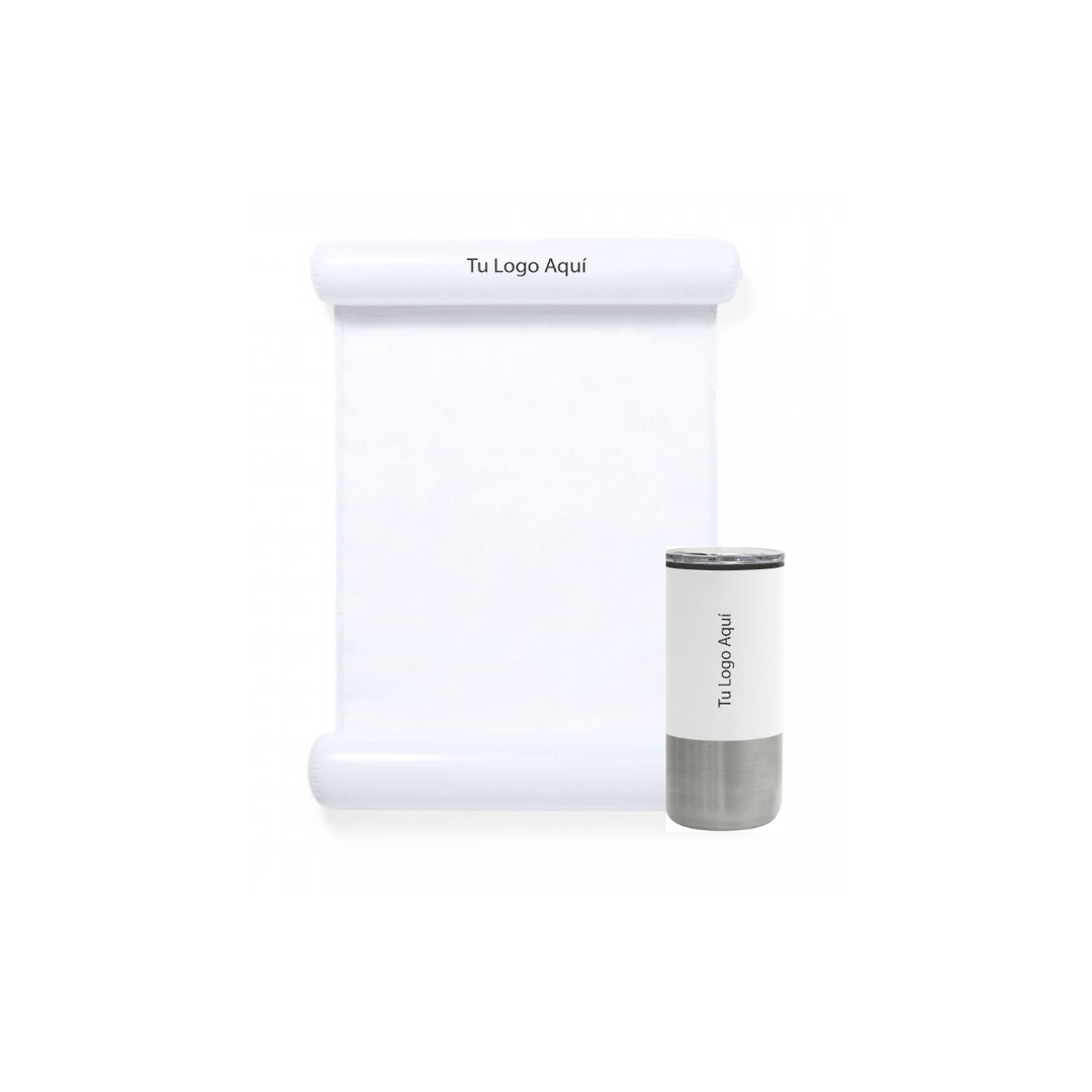 Original colchoneta con extremos hinchables en resistente PVC. Enrollable y con redecilla central en poliéster de color blanco, 110 x 80 x 18cm, con logo a un color + Mug Nori, doble pared, capacidad 500 ml. Interior en plástico y exterior de acero inoxidable. Tapa plástica transparente a presión, base antideslizante, logo en grabado laser. Presentado en caja kraft de 30x20cm con gráfica y/o logo a un color.
