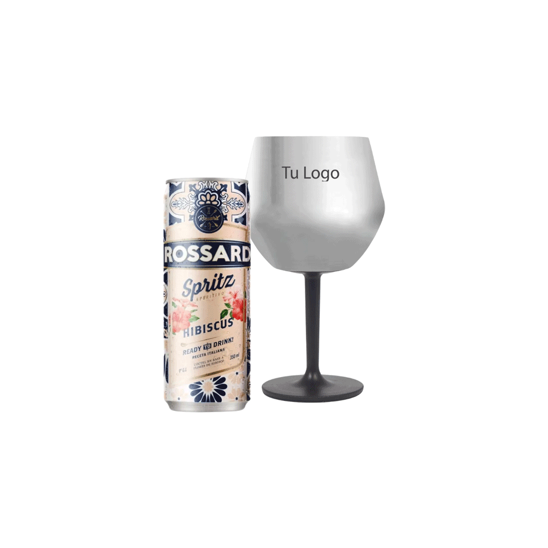 Copa plateada doble pared con base desmontable para ser usado como vaso y copa, con logo a un color + Rossard spritz hibiscus 350cc (sabor segun stock). Presentado en caja negra premium de 16x16cm con logo a un color y cinta a elección.