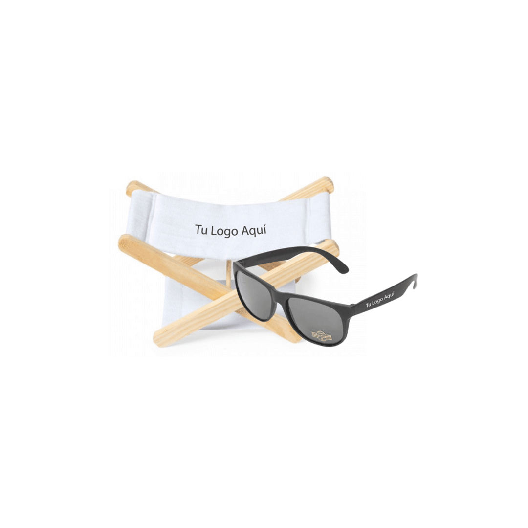 Original reposacabezas plegable, con estructura fabricada en madera y tela en 100% algodón de acabado natural. Plegable. con logo a un color + Lentes de sol realizados en Polipropileno. Medidas: 13,8 x 4,7 cm. con logo a un color. Presentado en caja kraft de 30x20cm con logo y/o gráfica a un color.