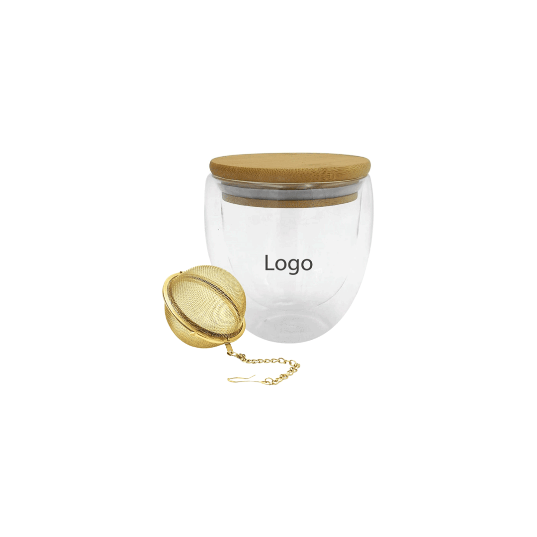 Incluye una taza de doble vidrio con tapa de bambú que además se puede utilizar como posa taza/vaso. 9 x 9,5 cm. medida de la taza. Capacidad 250ml con logo full color + Un infusor de té acero inoxidable para taza. Presentado en caja Kraft con adhesivo personalizado por cliente.