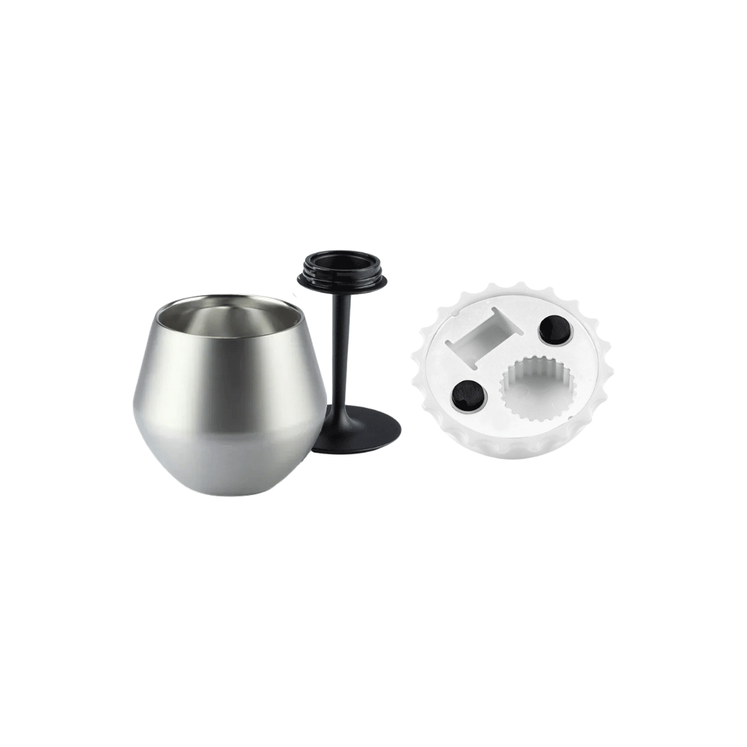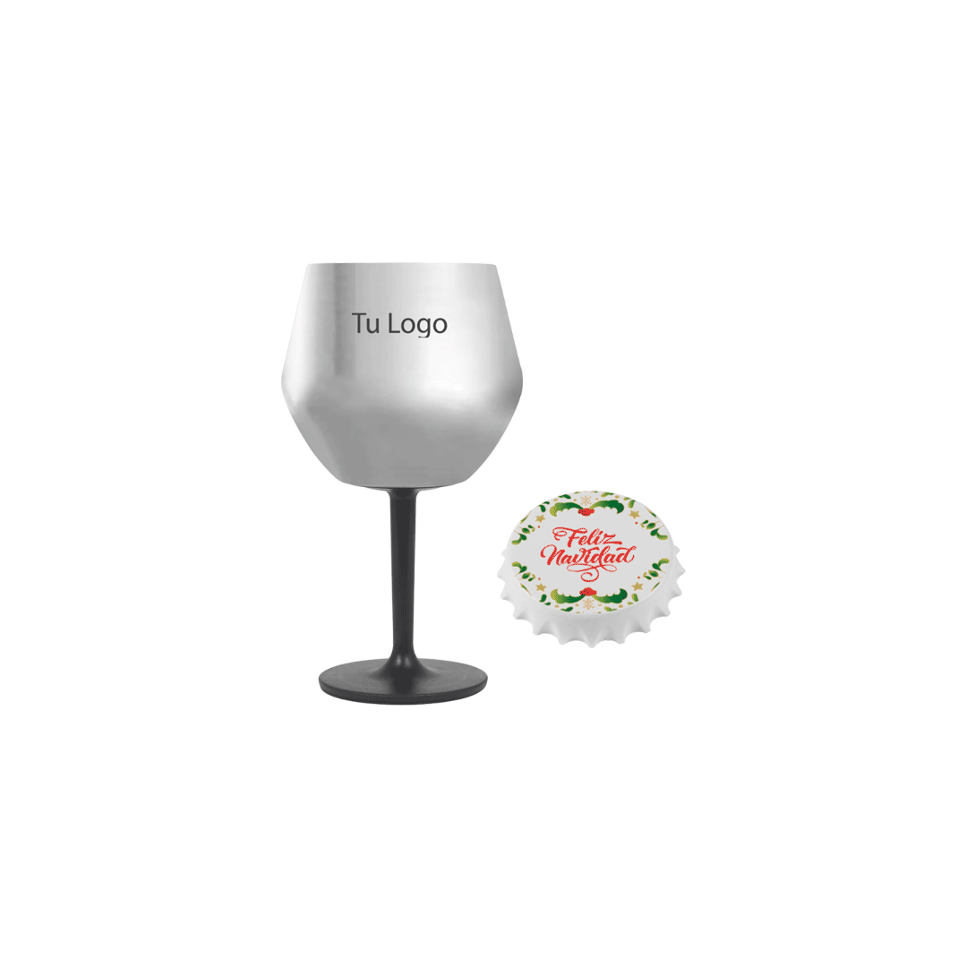 Copa plateada doble pared, con base desmontable de plástico color negro, puede ser usado como vaso o copa, incluye logo a un color + Destapador y Abridor de tapas twist-off, con forma de tapa de botella. Imantado para refrigerador. Tamaño: 8 cm. con logo a full color. Presentado en caja kraft negra con adhesivo personalizado por cliente.