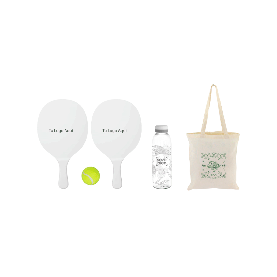 Set de Paletas de Playa de MDF esmaltado de 12mm de espesor. Incluye bolso de tela poliéster blanco con frente malla y cinta para colgar. Logo a un color en ambas paletas + Pelota de tenis amarilla + Botella baladina, plástico transparente con tapa a rosca color blanco mate con anillo de silicona de diferentes colores, capacidad 700 ml. con logo a full color. Presentado en bolsa crea tote bag de algodón con gráfica y logo corporativo a 1 color.
