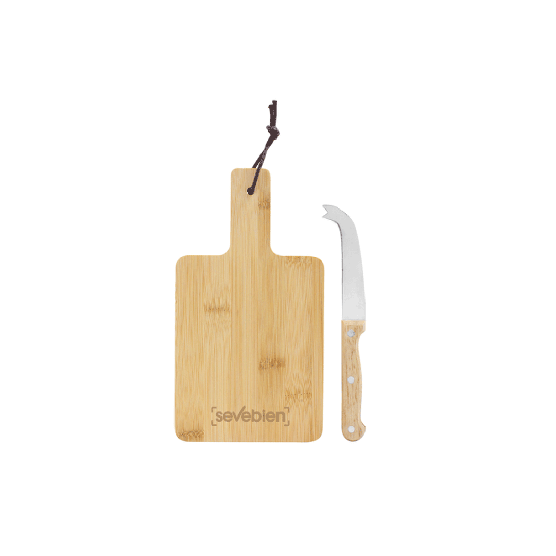 Tabla de corte, tamaño 22 x 12 x 1,2 cm, con recubrimiento de aceite vegetal y correa en el mango. Cuchillo de 19,5 cm de largo, de acero inoxidable y mango de madera, logo en grabado laser en tabla. IMPORTANTE: Las tonalidades y las vetas de la madera pueden variar entre una pieza y otra y por consecuencia el acabado final del grabado láser. Presentado en caja kraft con adhesivo personalizado por cliente.