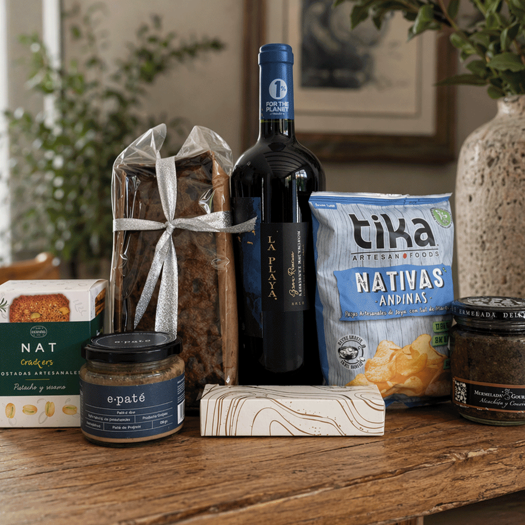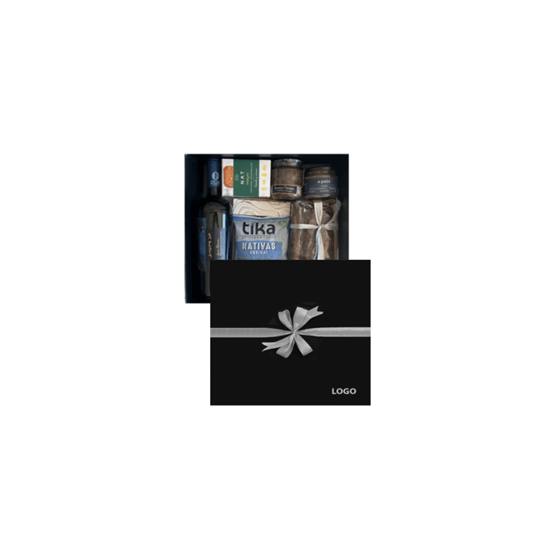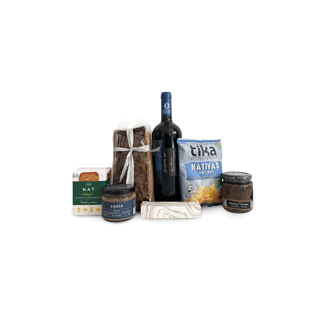 Contiene un vino cabernet Sauvignon la playa 750ml más un pan de pascua, tostadas artesanales con sabores según stock 80gr, chips de papas, tapanade de aceitunas 220gr, pate al ron 180gr y una caja de 3 calugas. Presentado en caja premium imantada de 32x29cm con logo a un color y cinta a elección.