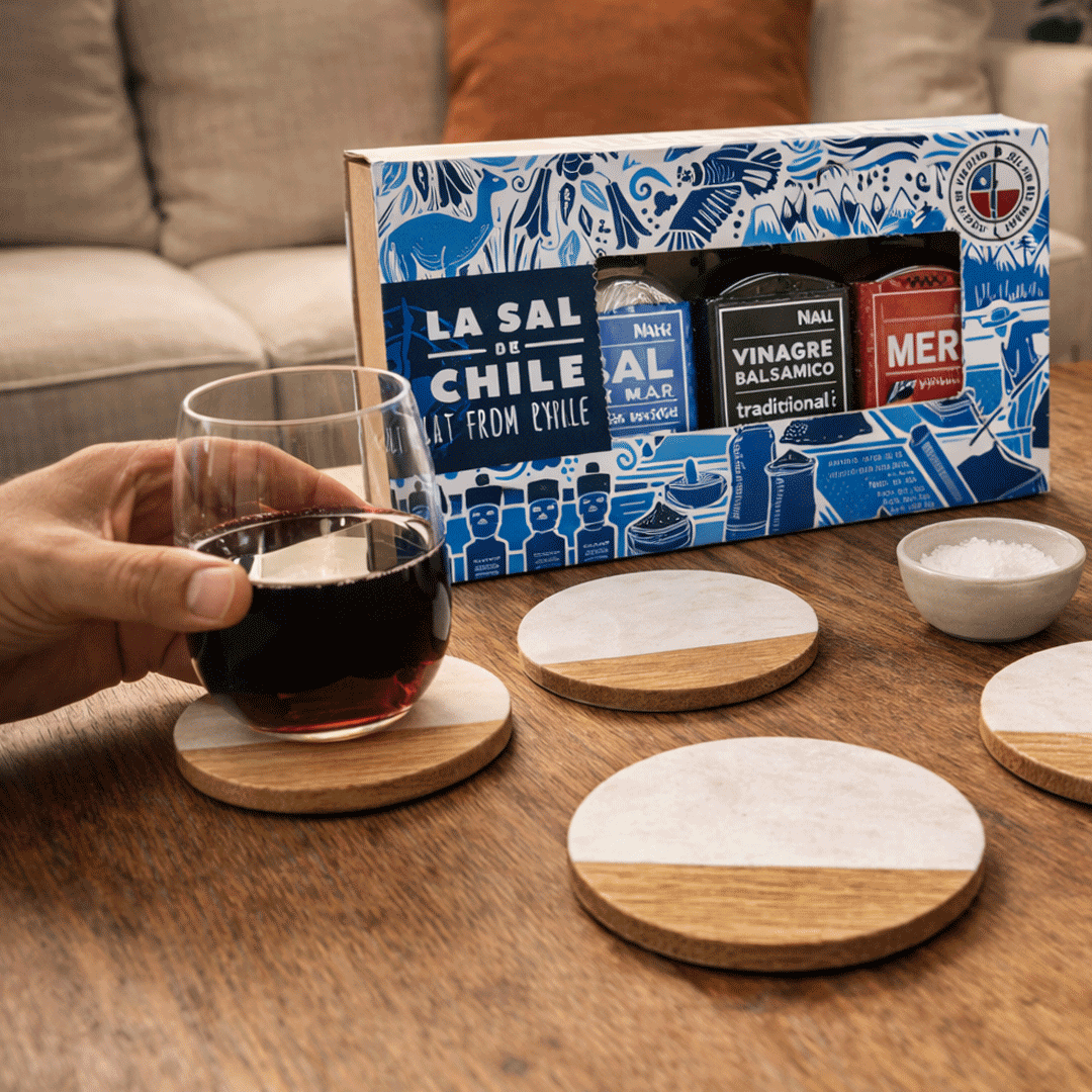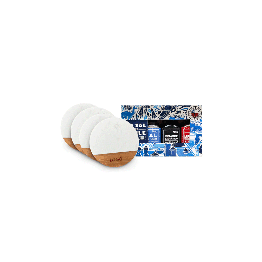 Contiene: Set de cuatro posavasos circulares de mármol blanco con madera. Tamaño de 10 cm de diámetro con logo a un color + pack genérico contiene 4 frascos 50 gr (Puede ser Sal de mar, Vinagre, Aceite de Oliva, Ají o Merken). Presentado en caja blanca premium imantada de 25.5×20 cms con logo a 1 color. Puede llevar cinta de regalo.