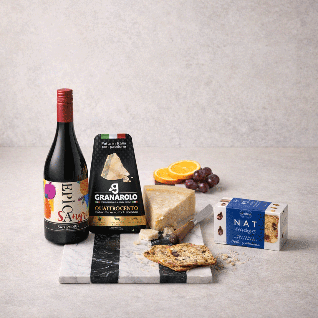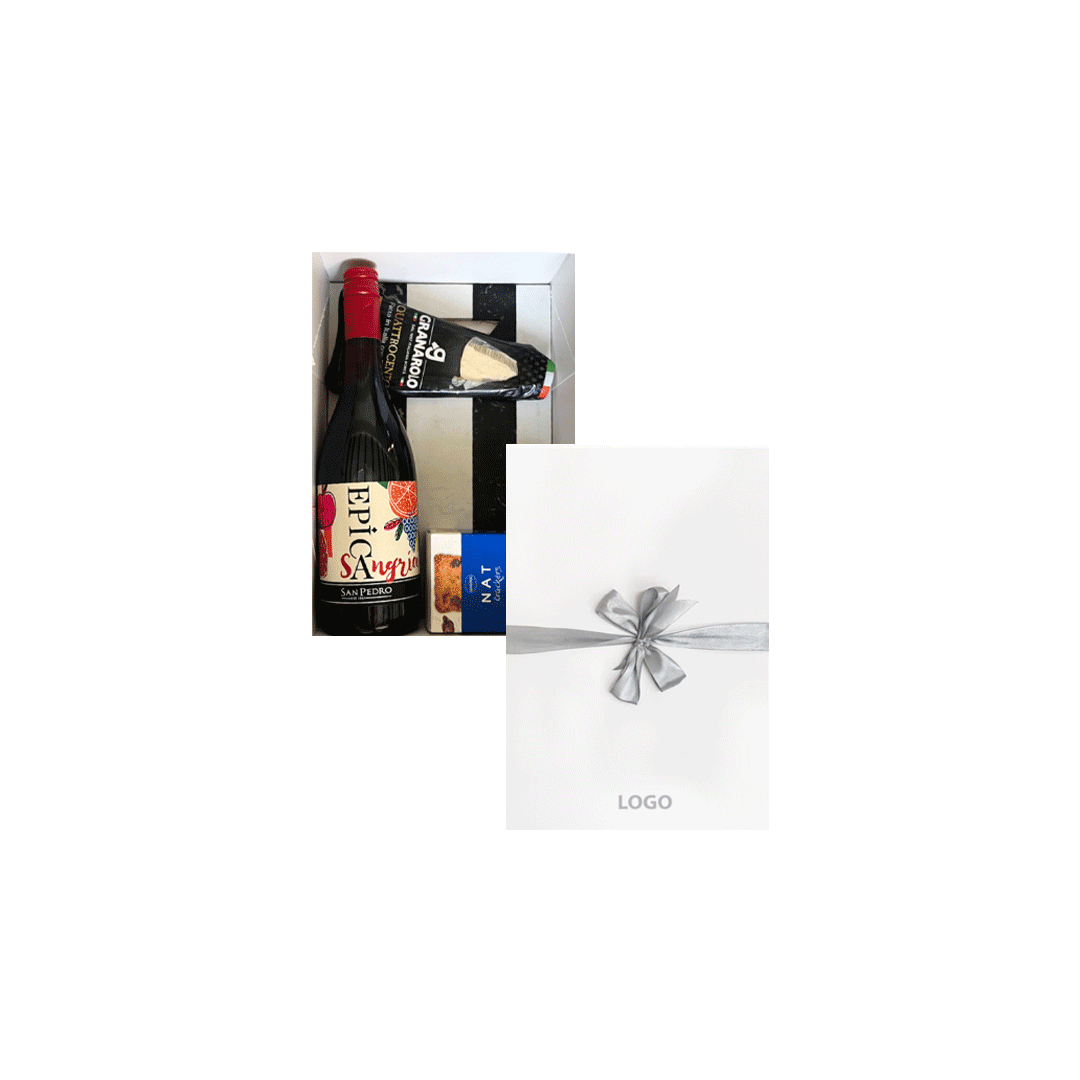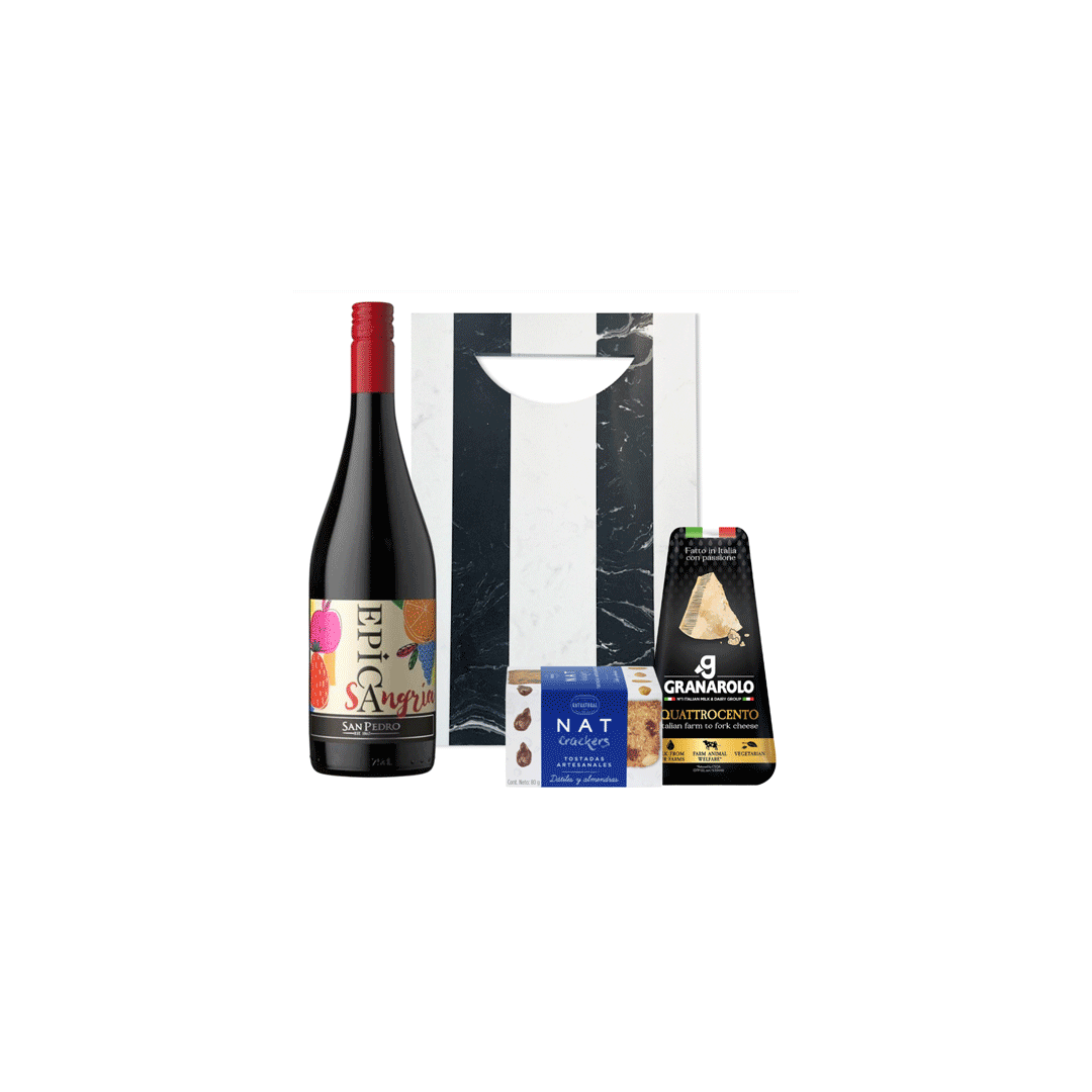 Contiene una Sangría San Pedro 750cc + Galletas NAT artesanales 80 gr + Queso Granarolo quattrocento 150 gr + Tabla de mármol reconstituido en color blanco y negro, tamaño 30x20cm, con logo a un color. Presentado en caja premium imantada de 30.5x20cm con logo a un color y cinta a elección.