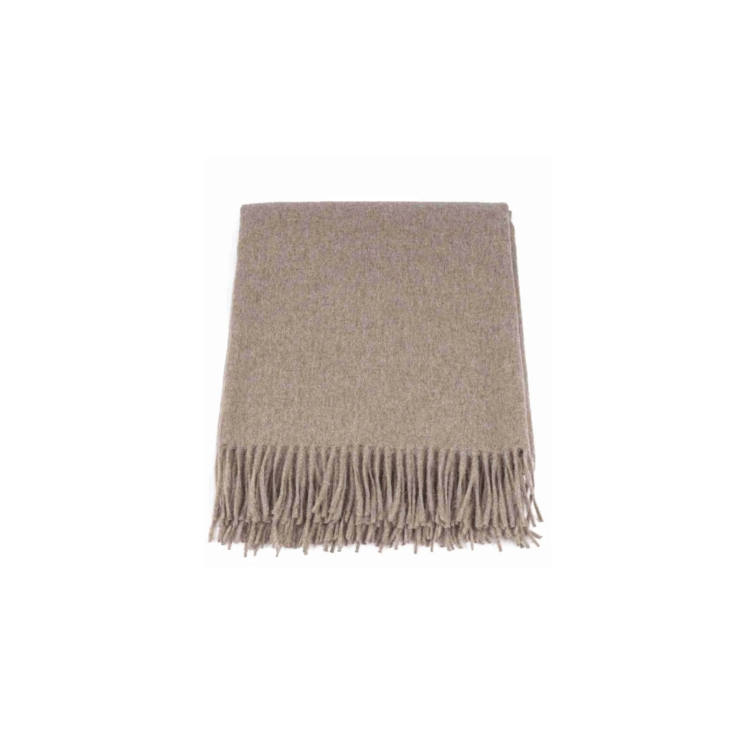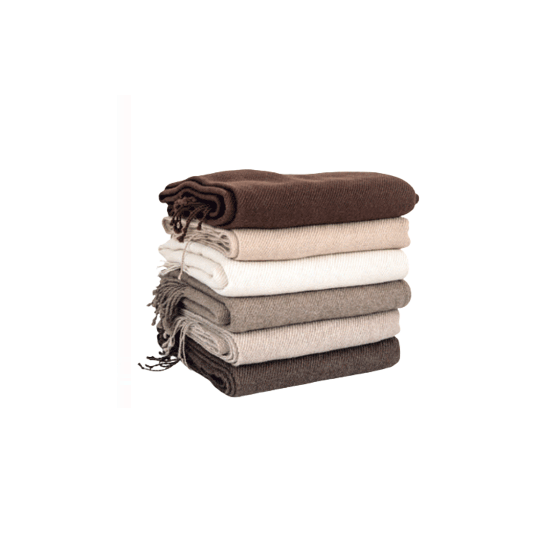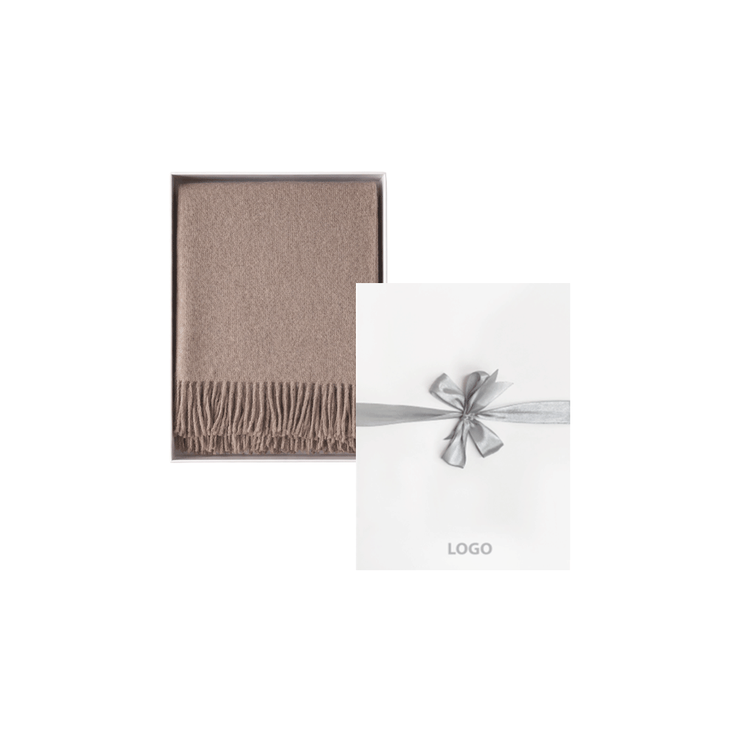 Tejida a telar, flecos a mano. Medidas: 200 x 80 cm. 55% Alpaca, 45% lana. Colores; grises, beige y celestes. Presentado en caja premium imantada de 34x23cm, con logo a un color y cinta a elección.