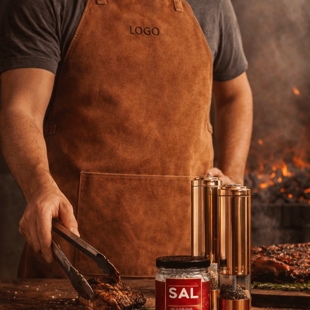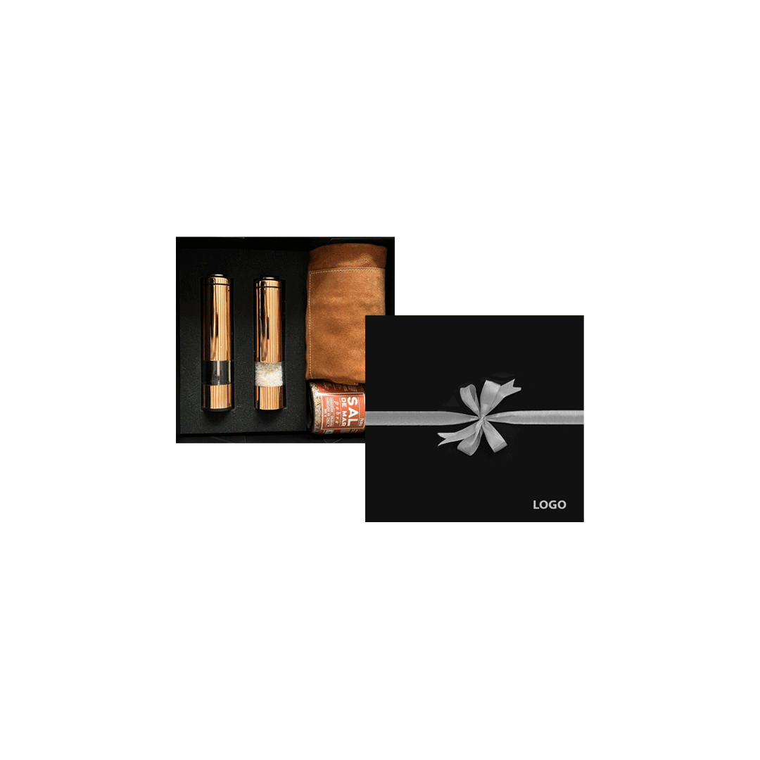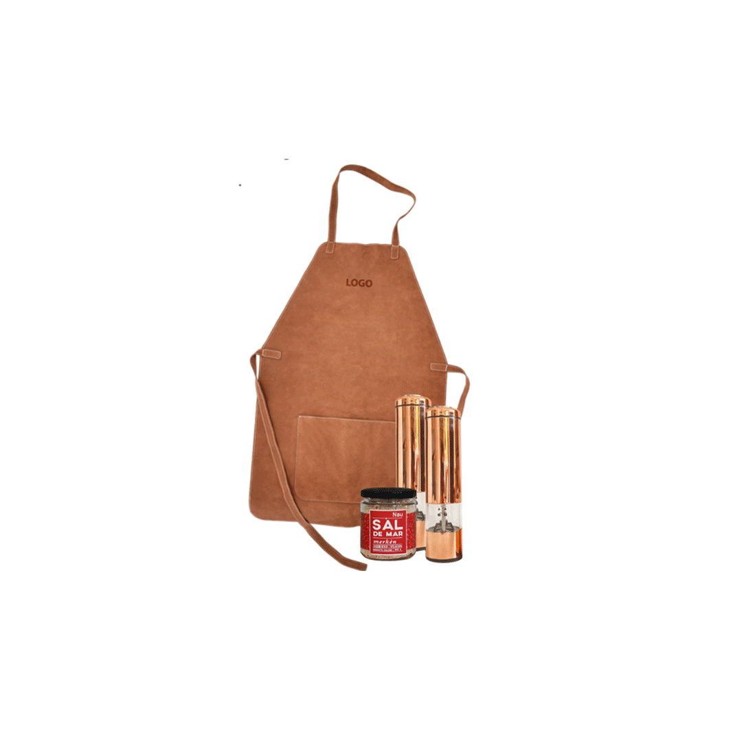 Set incluye dos especieros eléctricos cobrizados, con logo a un color en ambos productos, funciona con 4 pilas AA (no incluye). + Una sal Nau de 400gr sabores según stock + Pechera de reno con bolsillo con logo grabado. Presentado en caja premium imantada negra de 32x29cm con logo a un color y cinta a elección.