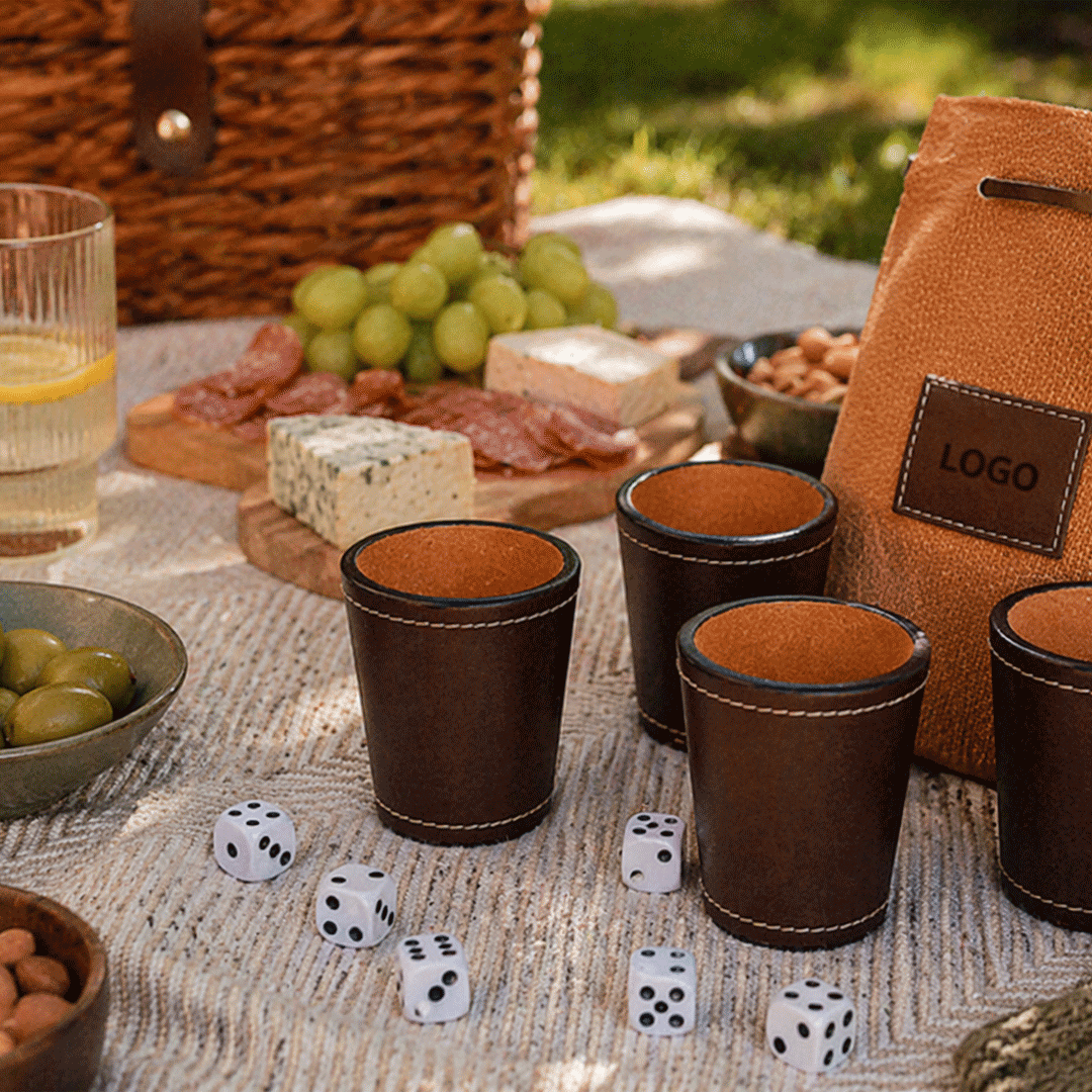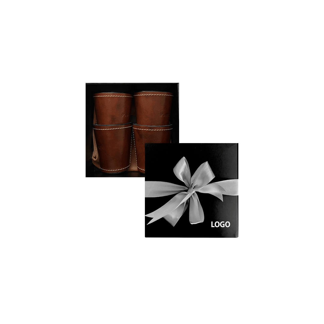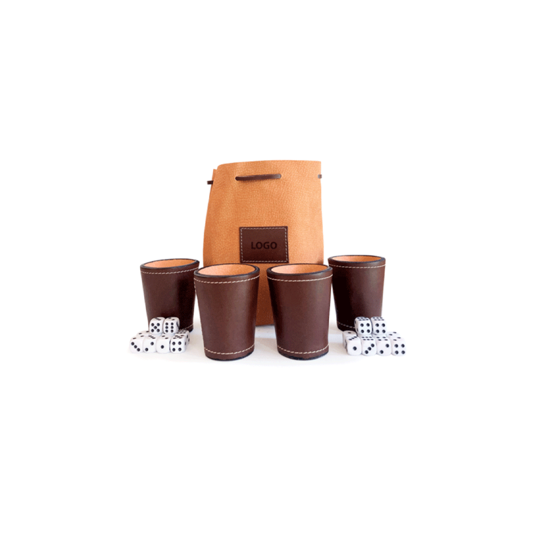Juego de 4 cachos con dados incluidos y bolsa de cuero para guardar el juego y protegerlo. Logo en cuño en cada vaso y bolsita. Presentado en caja premium imantada negra de 16x16cm, con logo a un color y cinta a elección.