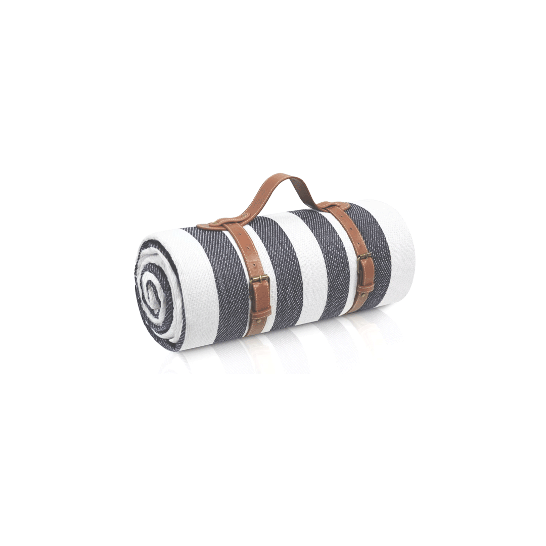 Manta de picnic rayada gris con blanco, es impermeable, ligera y con mango de ecocuero. Fabricada con 3 capas de material laminadas juntas que cumplen diferentes propósitos. Sin separación entre capas, acabado firme y suave. capas inferiores de Peva impermeables, segunda capa, acolchado de espuma para mayor comodidad y tercera capa, tela de poliéster suave y fácil de limpiar. Tamaño: 200 x 150 cm Peso: 1,1 kg Logo: grabado en mango de ecocuero. Presentado en bolsa de yute con lado de algodón, tamaño de 35x45x17cm con logo a un color.