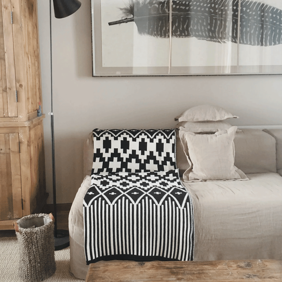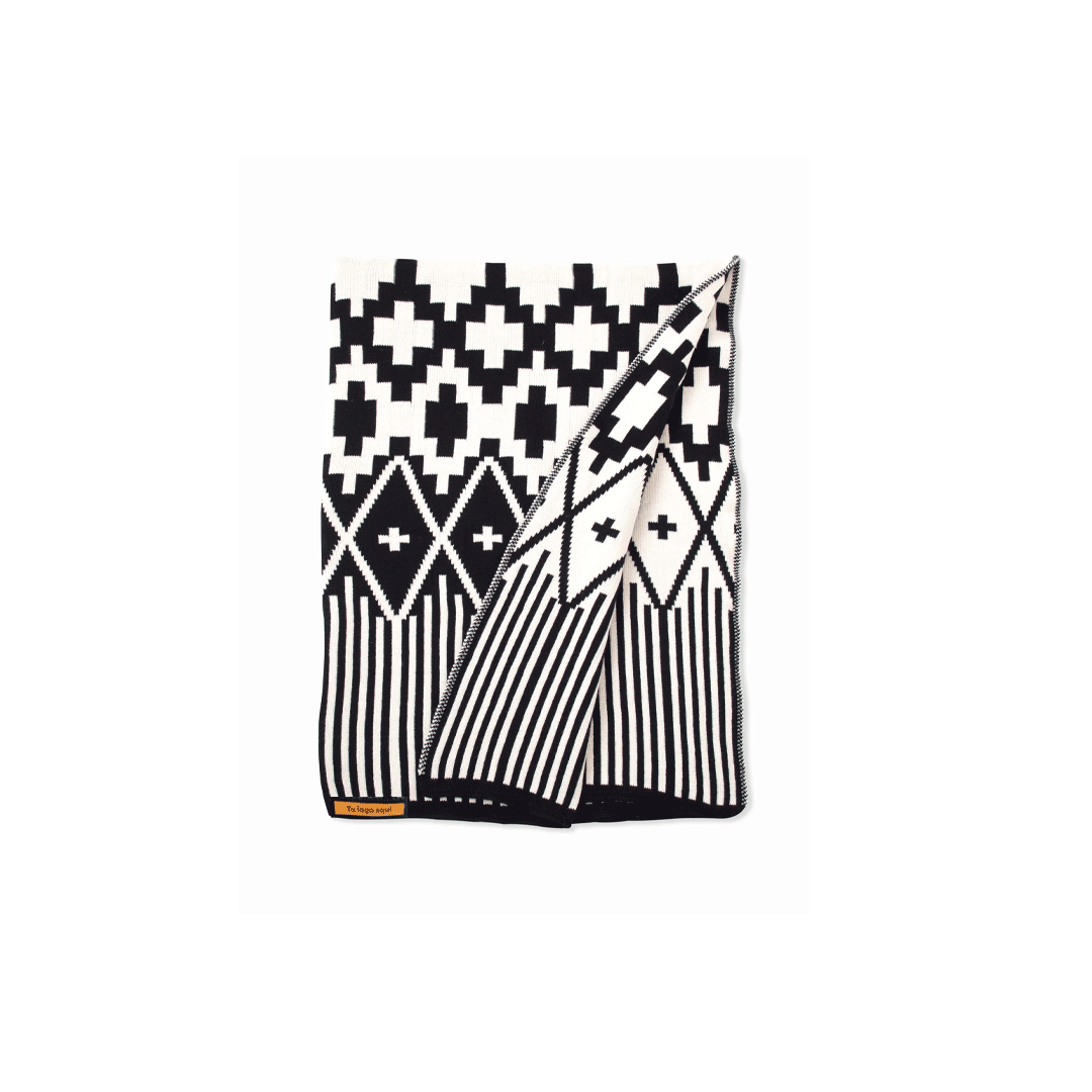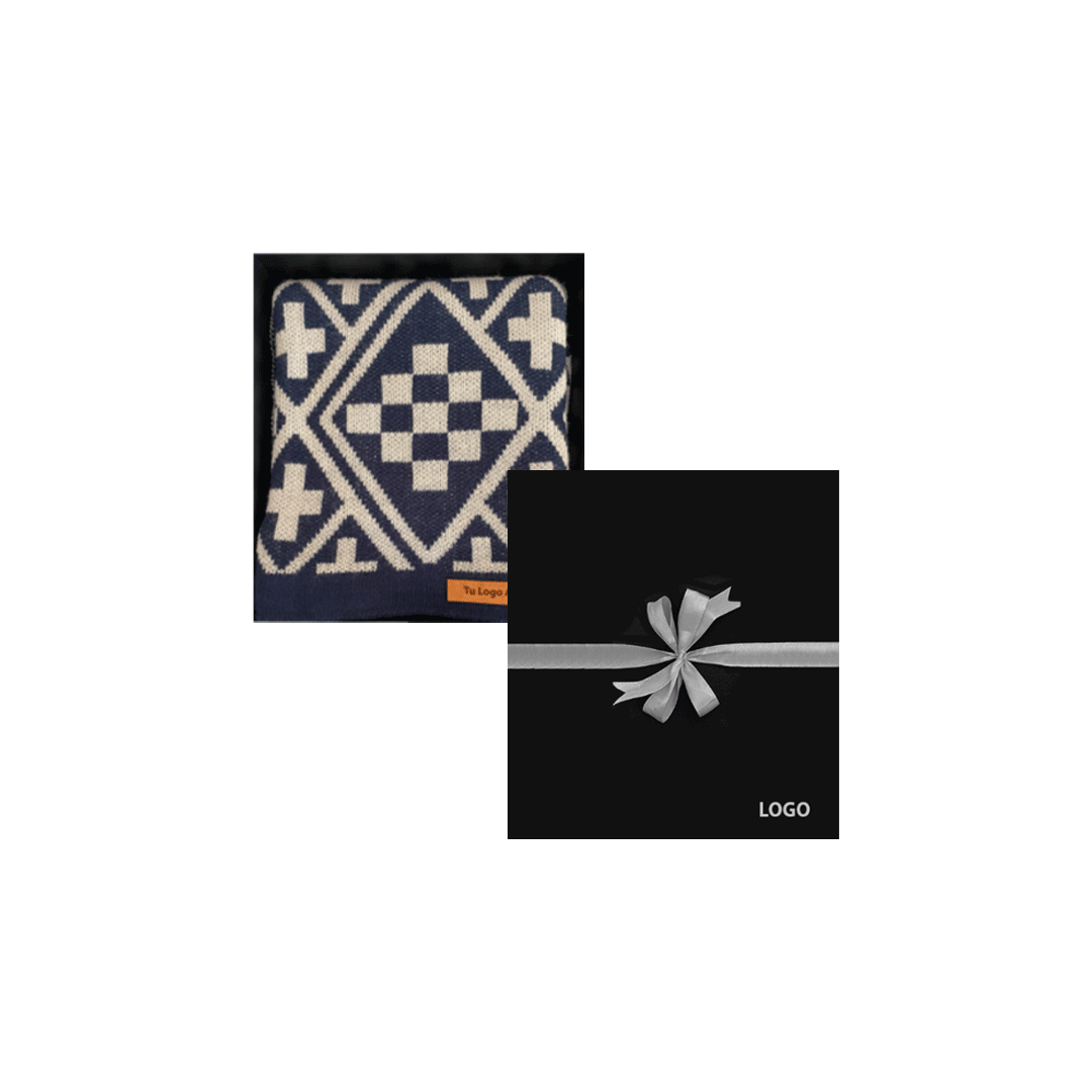 Manta de lana tejido a 2 colores, diseño personalizado. Puede usarse como piecera. Tamaño 1,20 x 1,80 cm de largo. Logo etiqueta de cuero grabada. Presentado en caja premium imantada de 32x29cm, con logo a un color y cinta a elección.