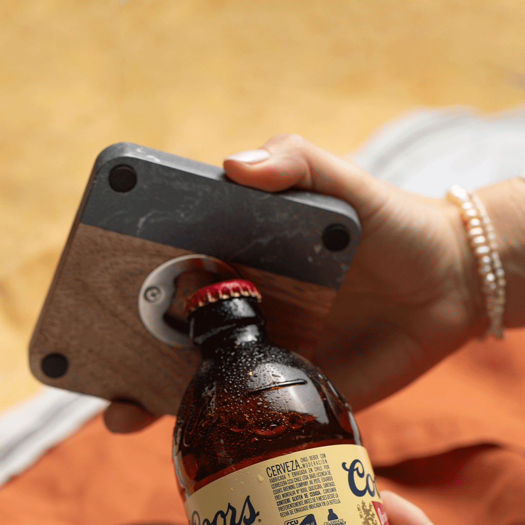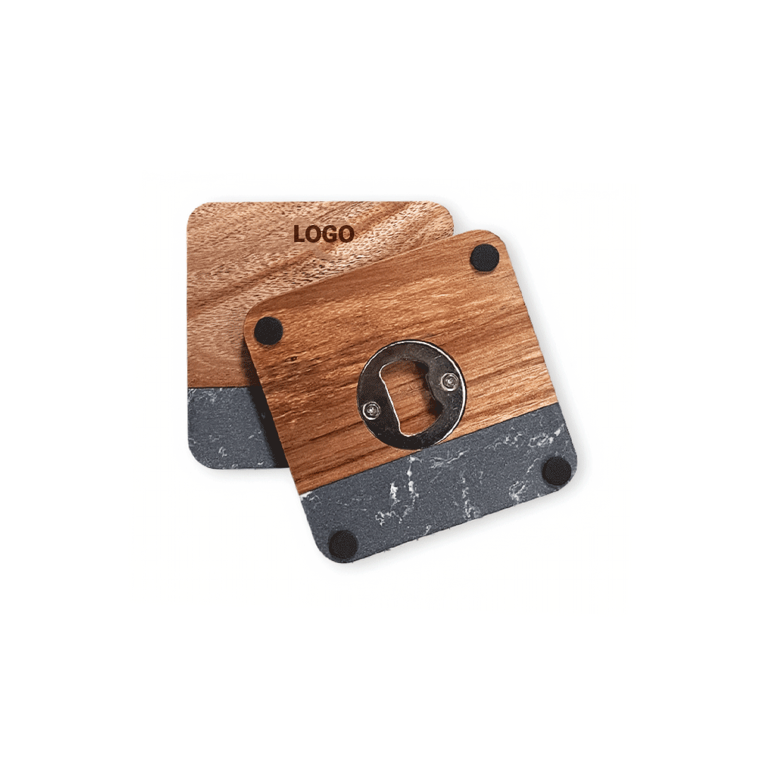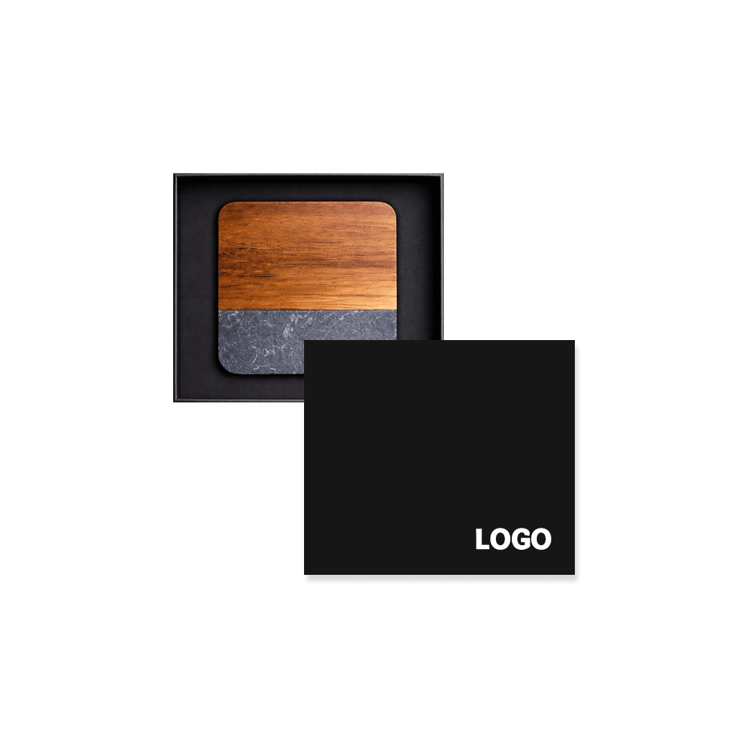 Juego de 2 posavasos cuadrados, de madera y mármol reconstituido en color negro, incluye descorchador en la parte trasera. Tamaño de 10cm, con logo grabado laser. Presentado en caja premium imantada de 16x16cm con logo a un color y cinta a elección.
