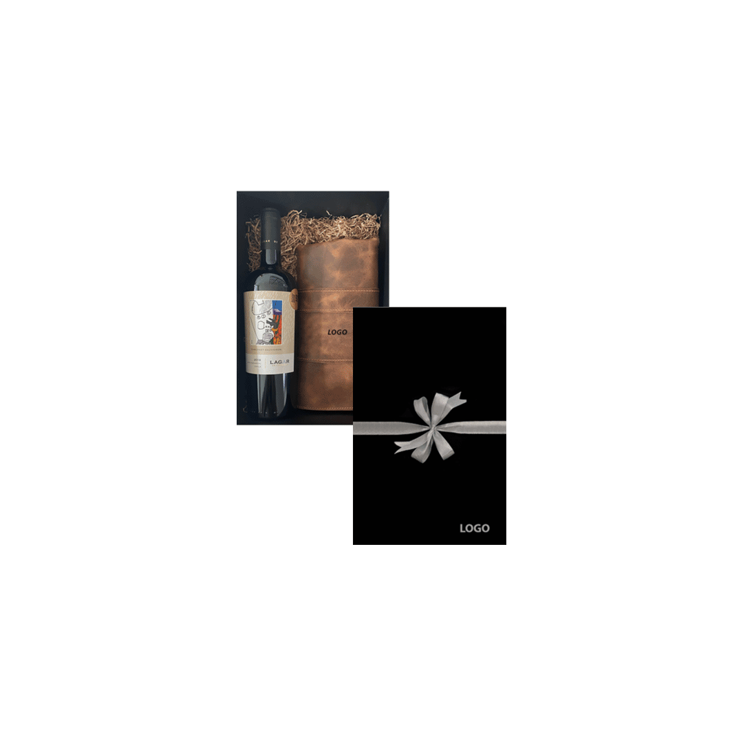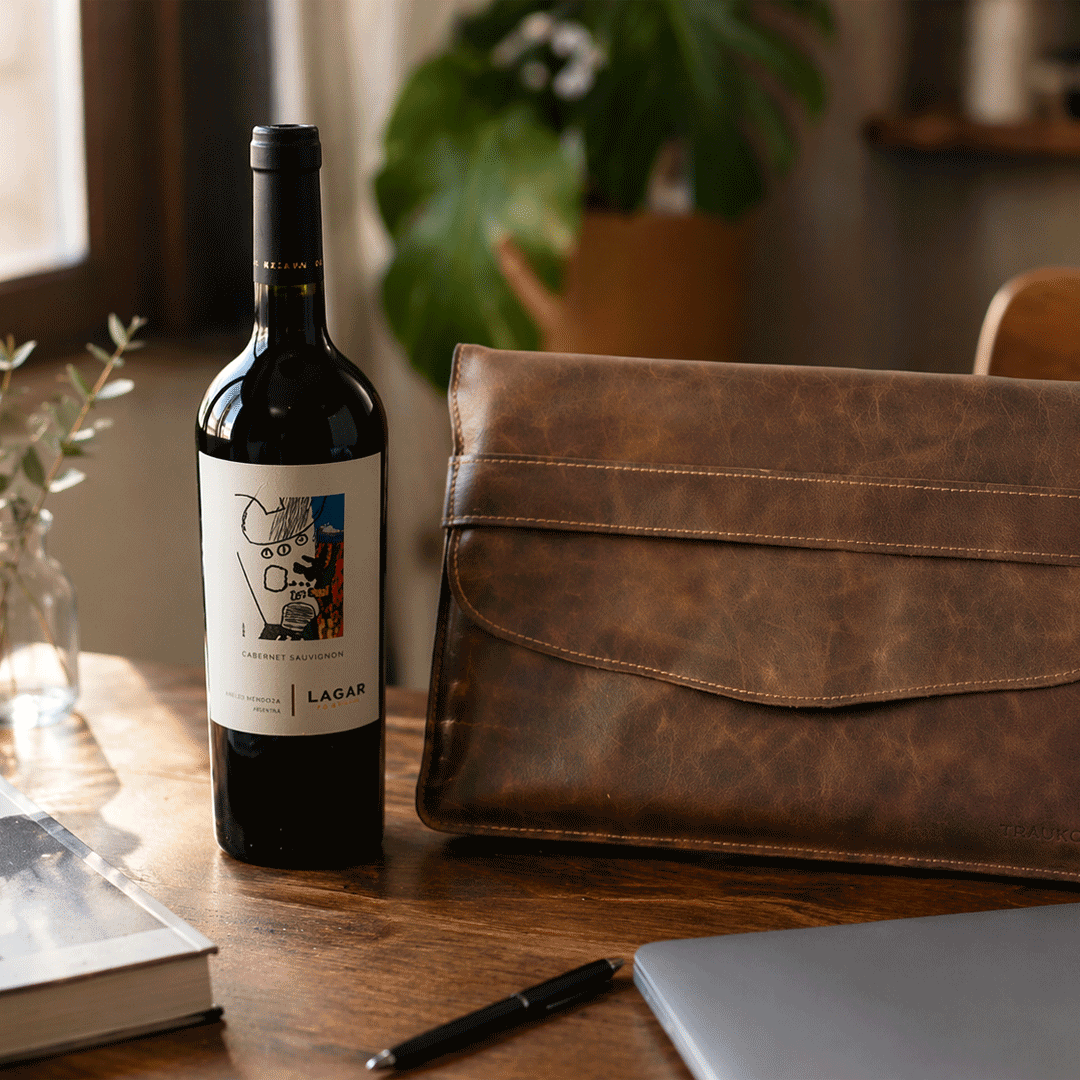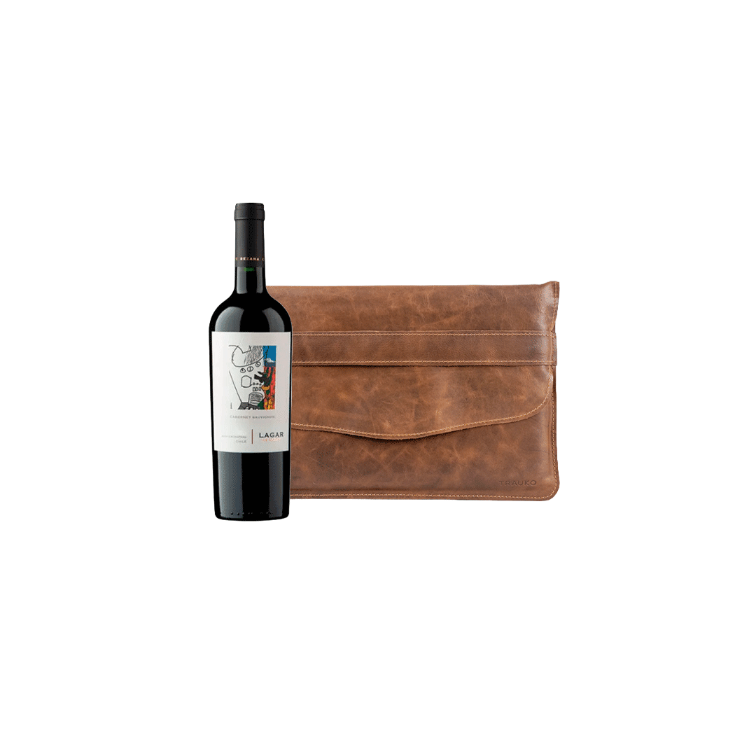 Un vino Lagar cabernet Sauvignon junto con una funda notebook 100% artesanal de cuero, con logo en funda en cuño. Disponible para tres medidas: 13″ (alto 25,5cm y largo 33,5cm), 15″ (alto 27,5CM y largo36,5cm) y 16” (alto 29 cm x largo 40,5 cms). Presentado en caja premium imantada de 34x23cm, con logo a un color y cinta a elección.