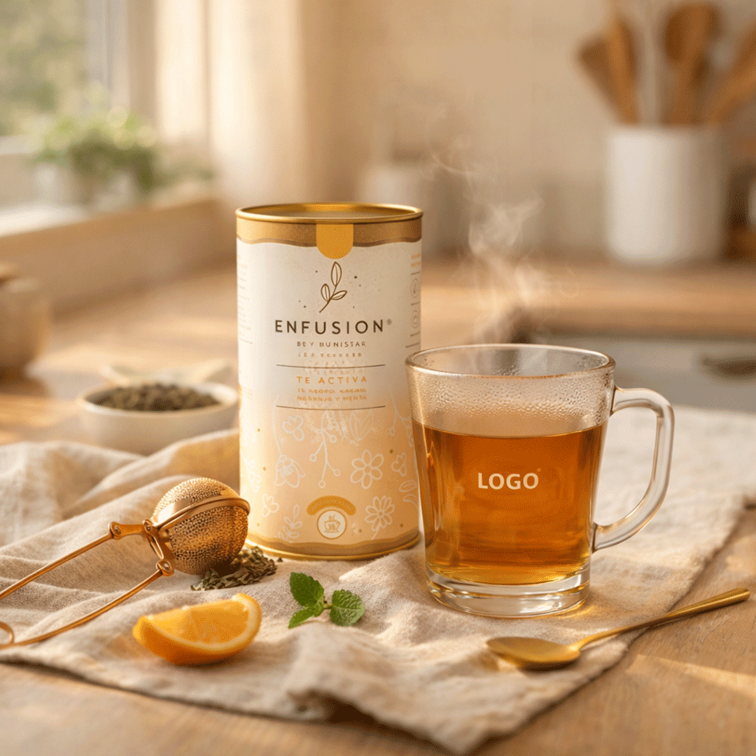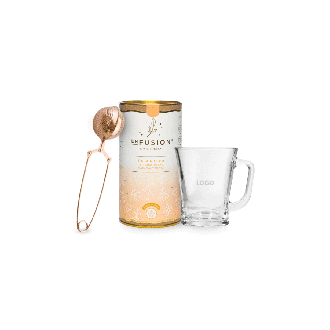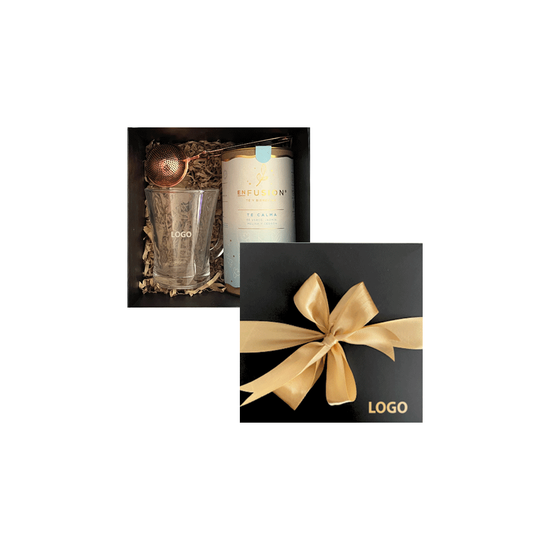 Contiene una taza de vidrio de 225 ml con logo incluido a un color + un tarro de té e infusión con sabores variados a elección segun stock + un infusor cobrizado tipo pinza. Presentado en caja negra 15×16 cms pequeña de 16x16cm con logo y/o grafica a un color.