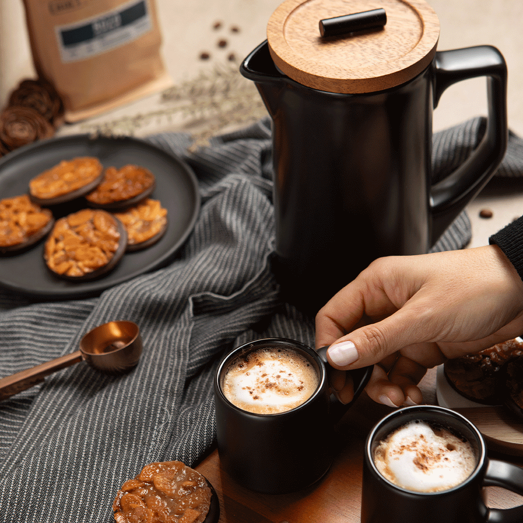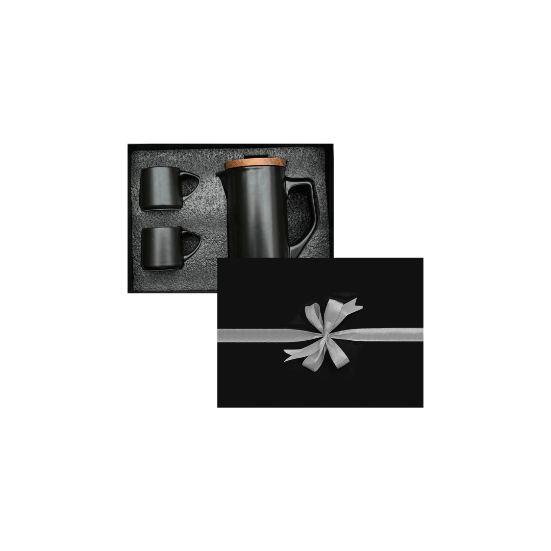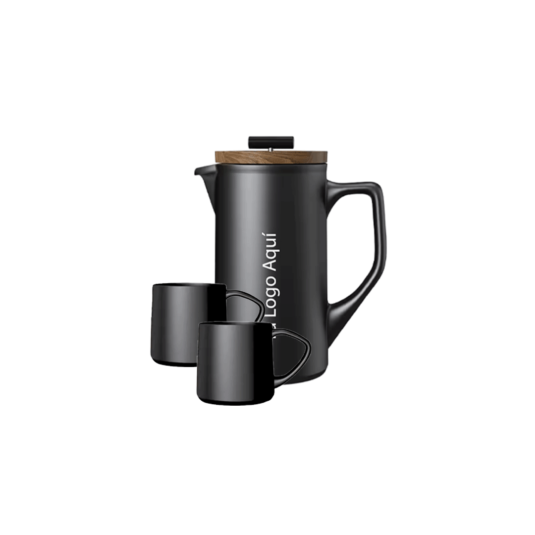 Cuerpo de cerámica de alta temperatura, preserva el sabor del café y prolonga el tiempo óptimo de consumo, tapa de madera de nogal natural, acero inoxidable 304 de grado alimenticio. Exterior mate, interior brillante. Capacidad cafetera: 600 ml. Capacidad tazas: 90ml. Incluye logo en cafetera. Presentado en caja premium negra con encajes, incluye logo a un color y cinta a elección.